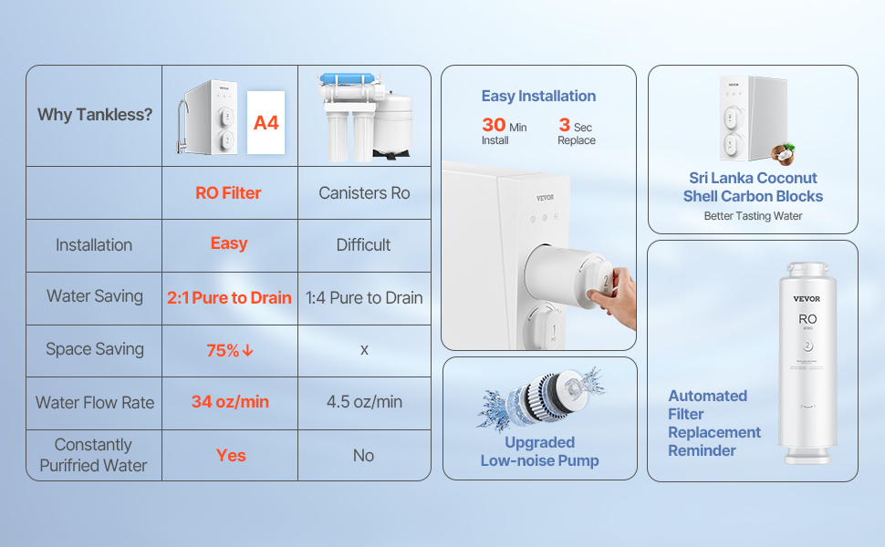 Náš beznádržový systém reverznej osmózy je určený pre domáce kuchyne, zázemie reštaurácií a kancelárske priestory na prípravu čaju. Rozlúčte sa so starosťami o vodu a vychutnávajte si čerstvú, čistú pitnú vodu každý deň.