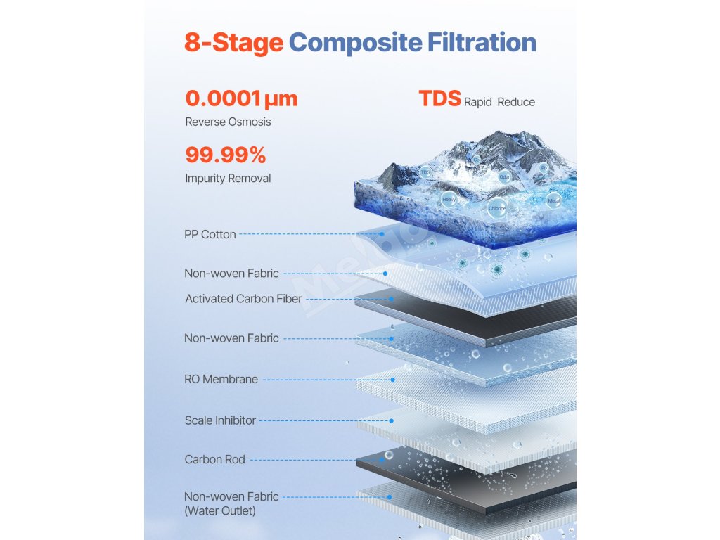 Náš beznádržkový systém reverznej osmózy, vybavený kompozitnými filtrami RO a PCF, poskytuje 8-stupňovú hĺbkovú filtráciu, ktorá účinne znižuje nečistoty a nepríjemné pachy a zároveň zlepšuje chuť každého dúšku.