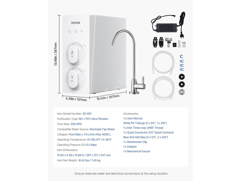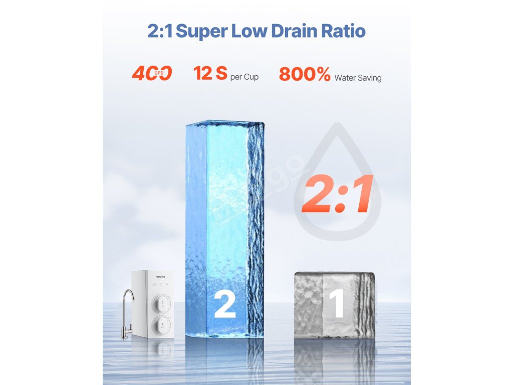 Vďaka pomeru čistej a odpadovej vody 2:1 tento beztlakový systém RO maximalizuje účinnosť vašej vody. Okrem toho jeho veľkorysá kapacita 400 GPD a prietok 1 l/min podporujú všetky vaše potreby, ako je umývanie ovocia, varenie a používanie spotrebičov.