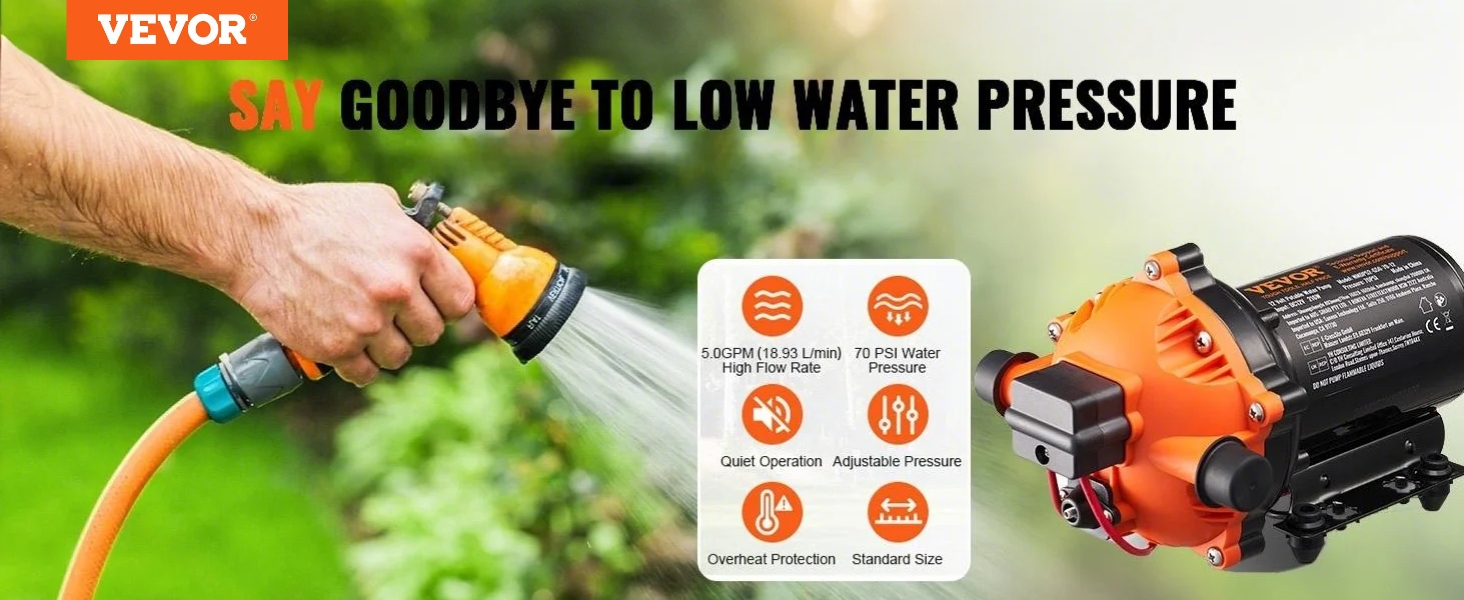 Toto 12 V membránové čerpadlo poskytuje pôsobivý prietok 5,0 GPM (18,93 l/min) a prednastavený tlak 70 PSI, čím zabezpečuje efektívne a spoľahlivé zásobovanie vodou. Je vybavené nastaviteľným tlakom 40 až 100 PSI, motorom z čistej medi a štandardným portom 1/2" MNPT. Zvýšte úroveň svojho vodného systému ešte dnes!