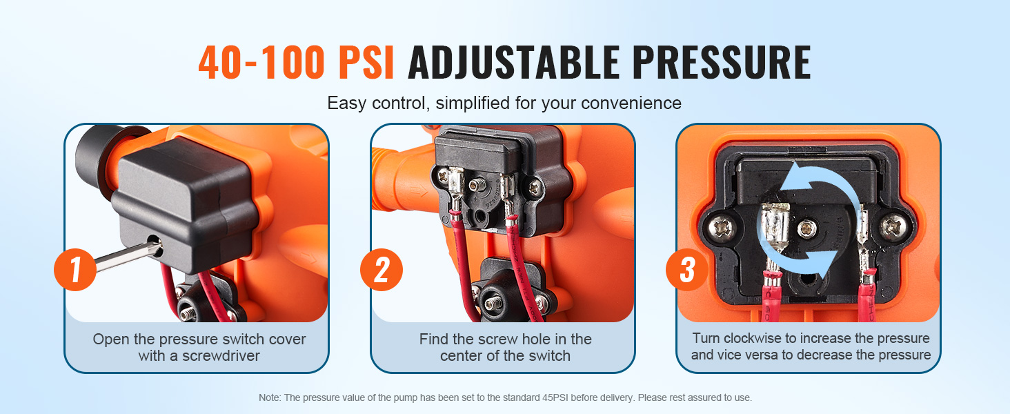 Prispôsobte si tlak vody bez námahy pomocou nášho 12 V membránového čerpadla. Stačí otvoriť tlakový spínač skrutkovačom, nájsť stredový otvor pre skrutku a otáčaním v smere hodinových ručičiek zvýšiť tlak alebo proti smeru hodinových ručičiek ho znížiť. Prispôsobte spotrebu vody svojim potrebám a efektívne šetrite vodou.