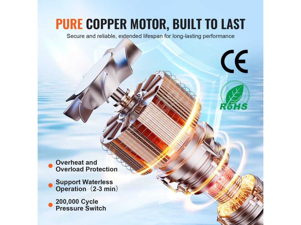 Naše 12 V vodné čerpadlo s tlakovým spínačom má vysokokvalitný motor spojený s plastovým telom čerpadla, čo účinne znižuje hluk. Antivibračná základňa a vankúšová konštrukcia ďalej minimalizujú zvuk, čím poskytujú tiché a účinné riešenie na čerpanie vody pre pokojné prostredie.