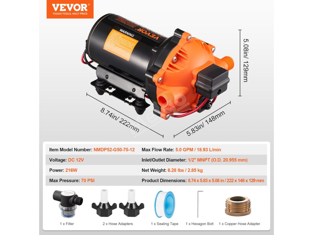 Toto 12 V membránové čerpadlo poskytuje pôsobivý prietok 5,0 GPM (18,93 l/min) a prednastavený tlak 70 PSI, čím zabezpečuje efektívne a spoľahlivé zásobovanie vodou. Je vybavené nastaviteľným tlakom 40 až 100 PSI, motorom z čistej medi a štandardným portom 1/2" MNPT. Zvýšte úroveň svojho vodného systému ešte dnes!