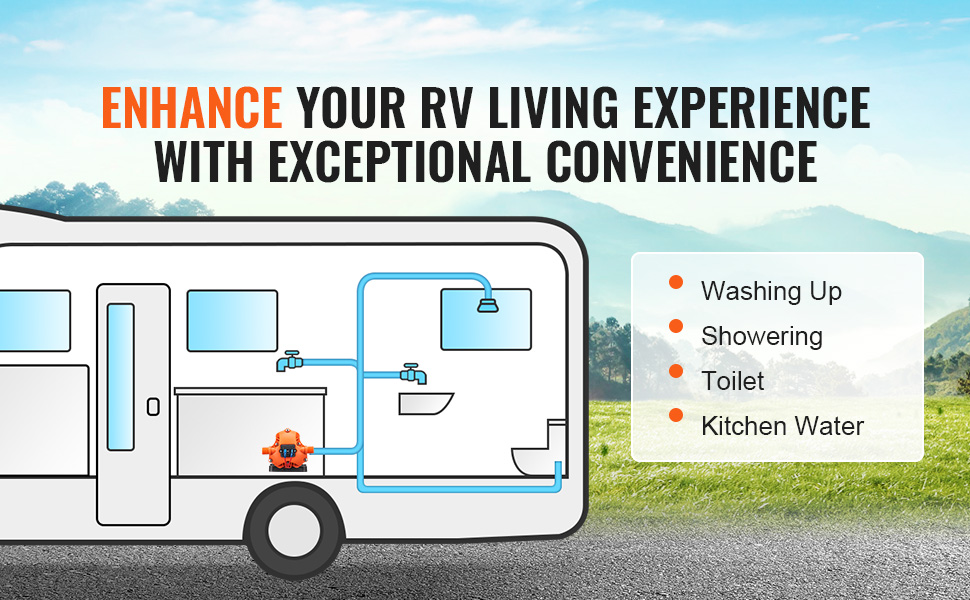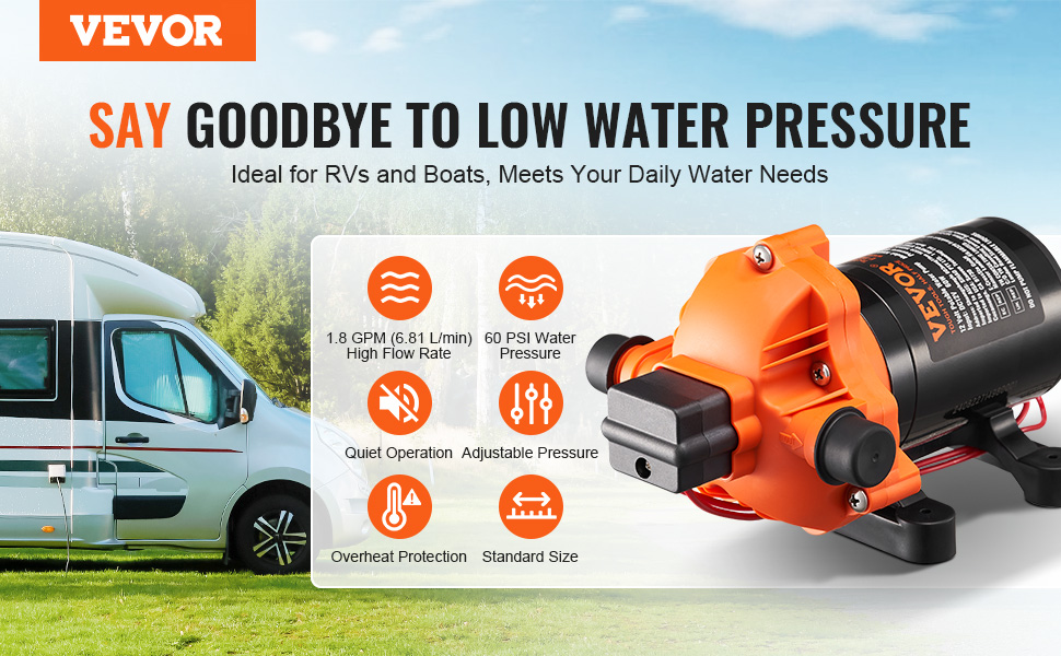 Naše 12V vodné čerpadlo pre obytné vozidlá bez námahy uspokojí všetky vaše potreby vody - od umývania a sprchovania až po používanie toalety a kuchyne. Užívajte si svoj život v obytnom vozidle naplno s čerpadlom, ktoré vás podporuje na každom kroku.