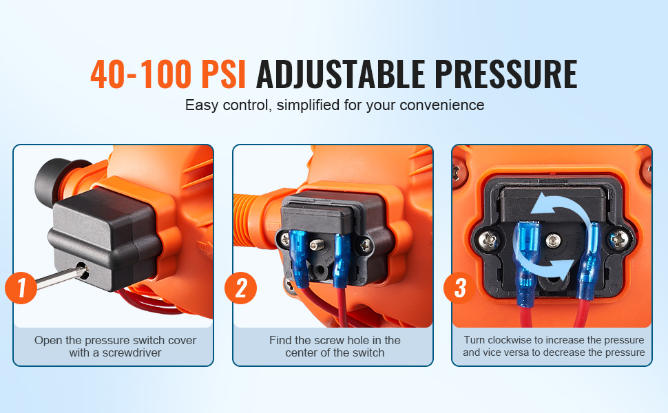 Prispôsobte si tlak vody bez námahy pomocou nášho 12 V membránového čerpadla. Stačí otvoriť tlakový spínač skrutkovačom, nájsť stredový otvor pre skrutku a otáčaním v smere hodinových ručičiek zvýšiť tlak alebo proti smeru hodinových ručičiek ho znížiť. Prispôsobte spotrebu vody svojim potrebám a efektívne šetrite vodou.