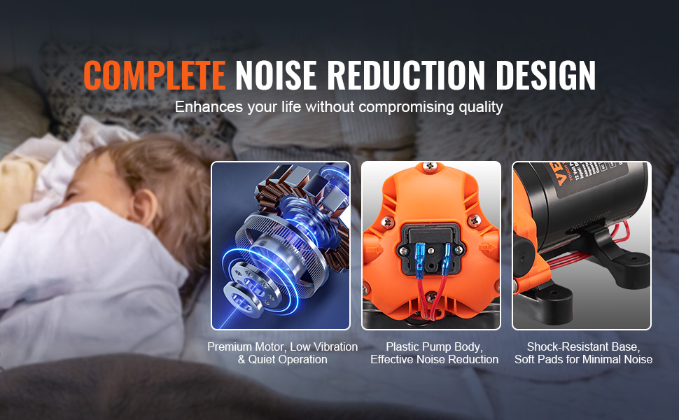 Naše 12 V vodné čerpadlo s tlakovým spínačom má vysokokvalitný motor spojený s plastovým telom čerpadla, čo účinne znižuje hluk. Antivibračná základňa a vankúšová konštrukcia ďalej minimalizujú zvuk, čím poskytujú tiché a účinné riešenie na čerpanie vody pre pokojné prostredie.
