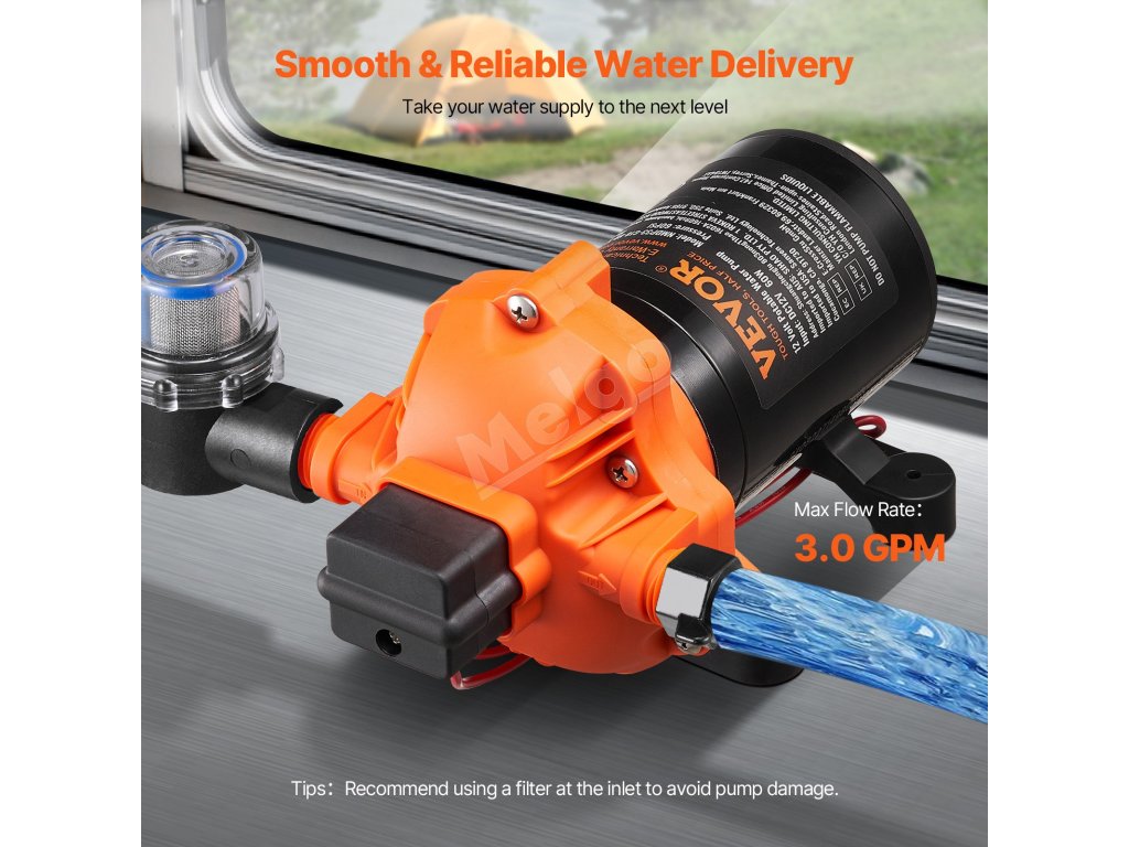 Naše 12V vodné čerpadlo pre obytné vozidlá bez námahy uspokojí všetky vaše potreby vody - od umývania a sprchovania až po používanie toalety a kuchyne. Užívajte si svoj život v obytnom vozidle naplno s čerpadlom, ktoré vás podporuje na každom kroku.