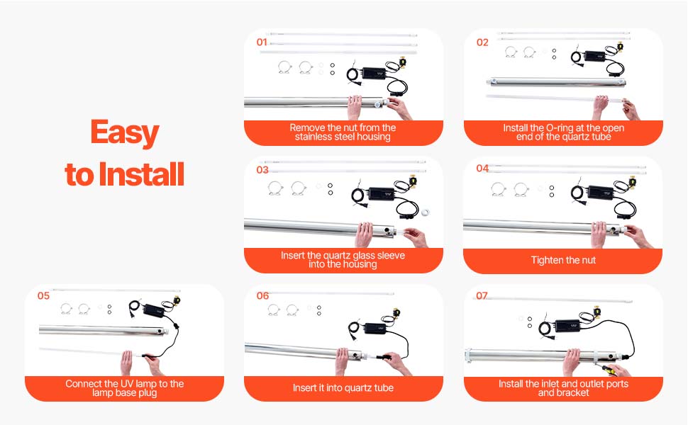 Náš UV čistič vody je navrhnutý s ohľadom na pohodlie používateľa a vyznačuje sa jednoduchými a rýchlymi krokmi inštalácie, vďaka čomu je proces nastavenia bezproblémový. Začnite s čistenou vodou v priebehu okamihu!