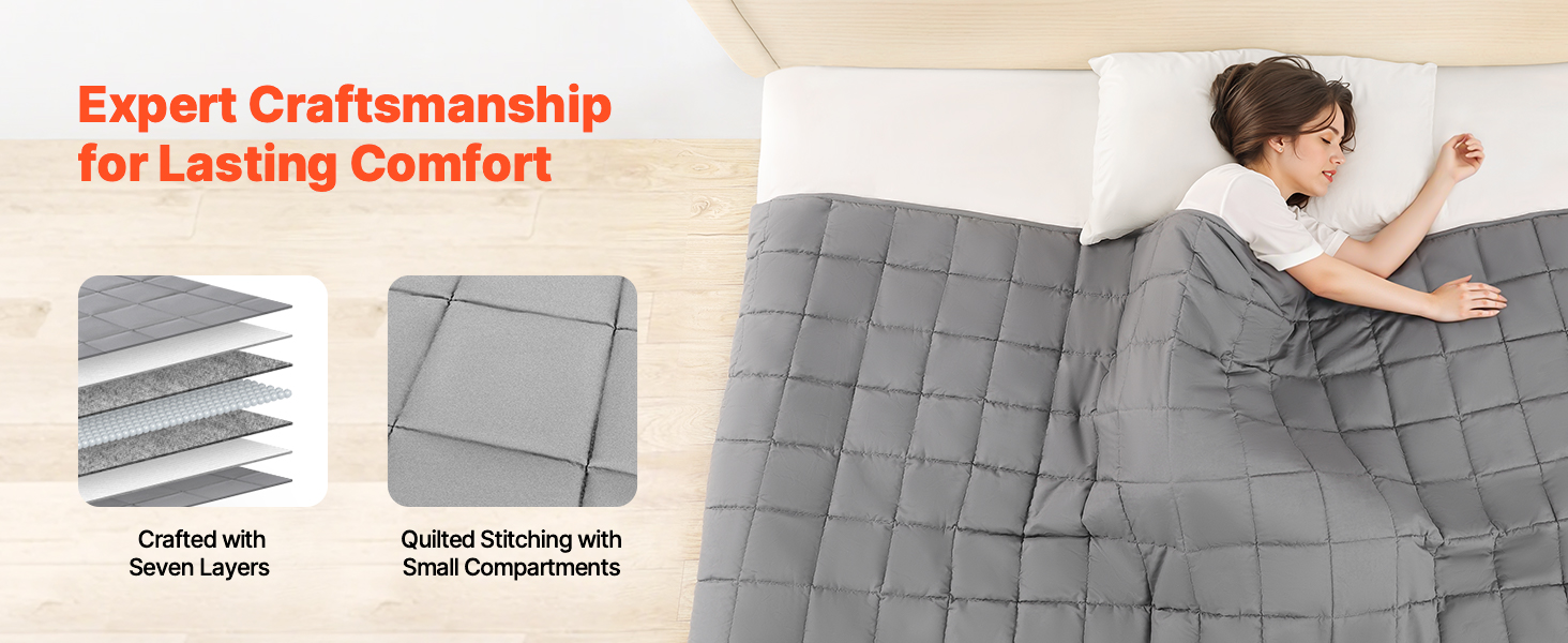 Naša záťažová deka kráľovskej veľkosti spája odolnosť s precíznym spracovaním. Sedemvrstvová konštrukcia zaisťuje, že prikrývka zostane v ideálnom tvare, zatiaľ čo prešívané švy rovnomerne rozdeľujú hmotnosť pre konzistentné pohodlie.