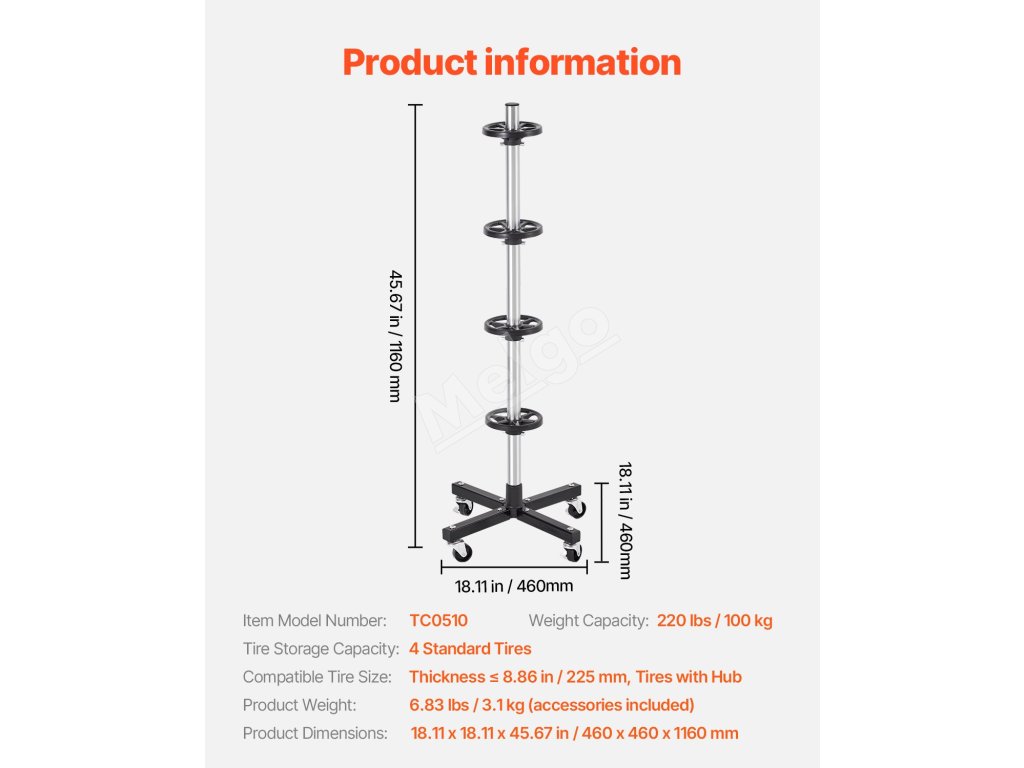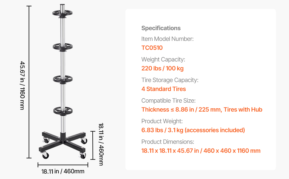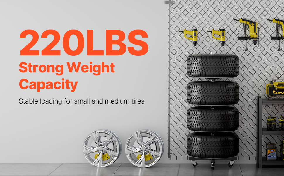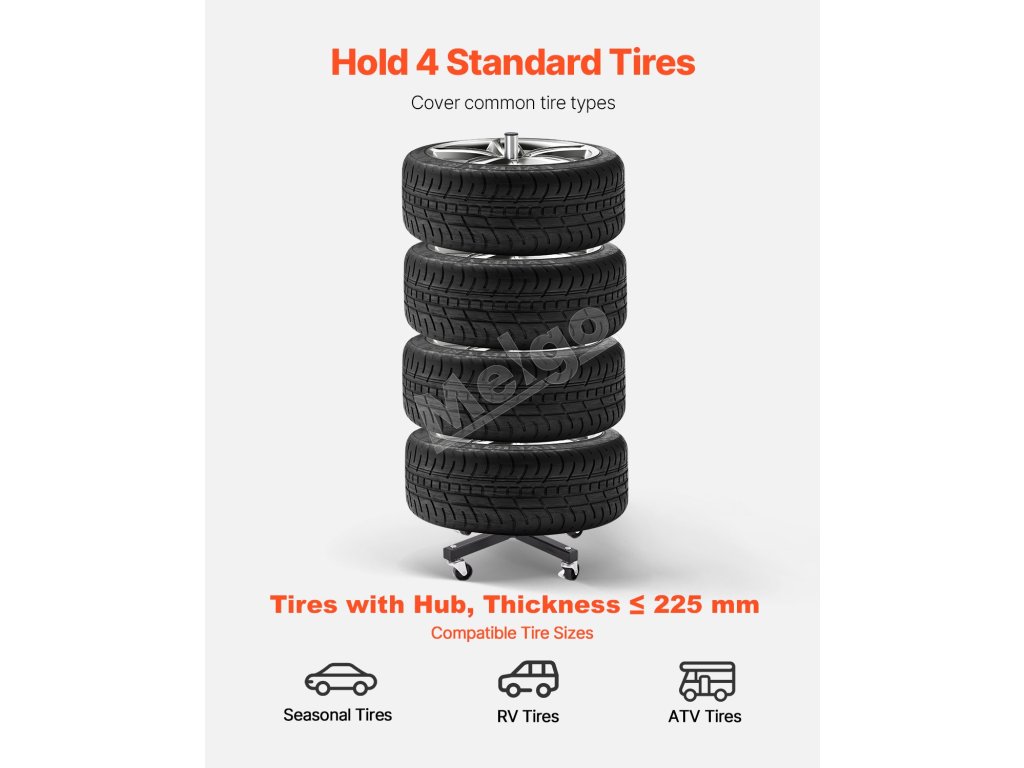 Tento stojan na pneumatiky so 4 kolesami pojme až 4 štandardné pneumatiky s diskami, pričom sa doň zmestia pneumatiky so šírkou až 8,86 palca (225 mm). Jeho robustný rám z nehrdzavejúcej ocele Q235 unesie až 220 kg a ponúka spoľahlivé, dlhodobé uskladnenie a zároveň šetrí miesto vo vašej garáži alebo dielni.