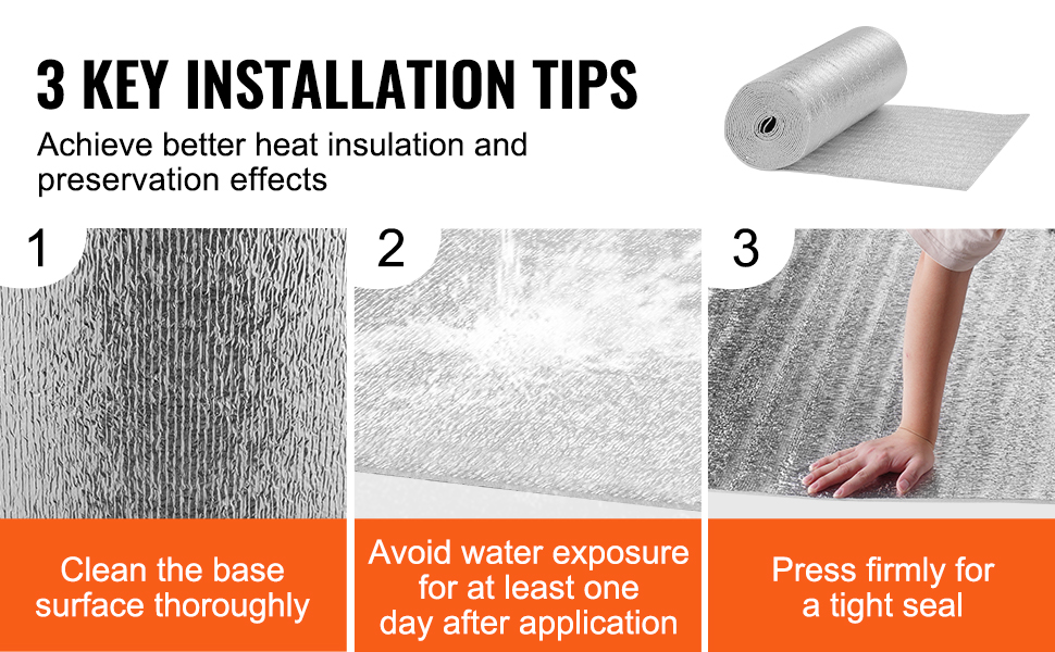 Ak chcete maximalizovať účinnosť tepelnej izolácie, zohľadnite tieto 3 tipy na inštaláciu: udržiavajte čistý a suchý podkladový povrch, po inštalácii nechajte aspoň jeden deň bez pôsobenia vody a pevne pritlačte, aby ste dosiahli tesné utesnenie a optimálny izolačný výkon.