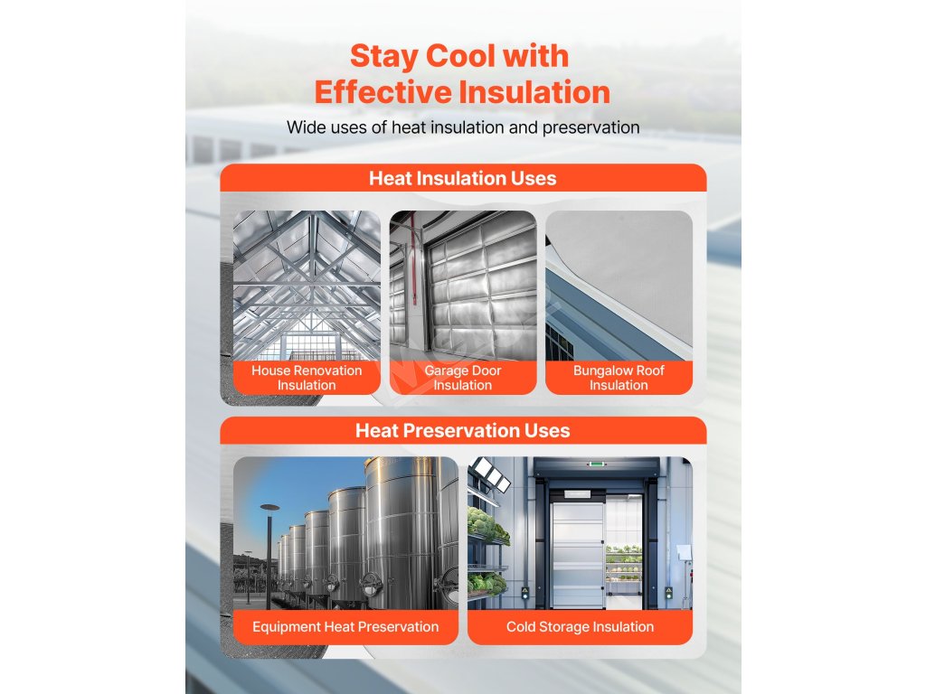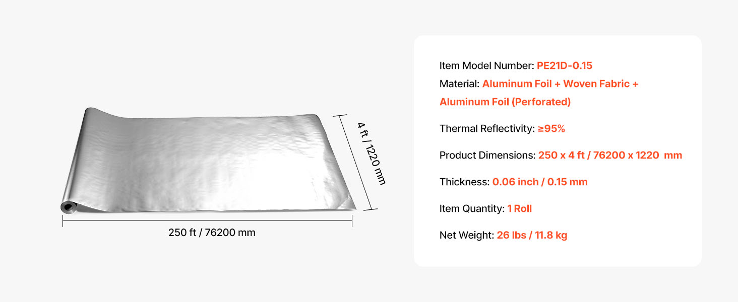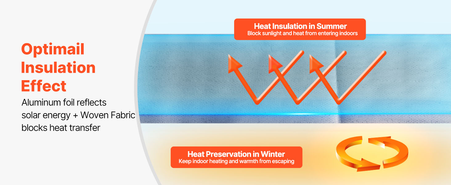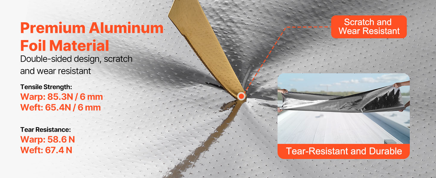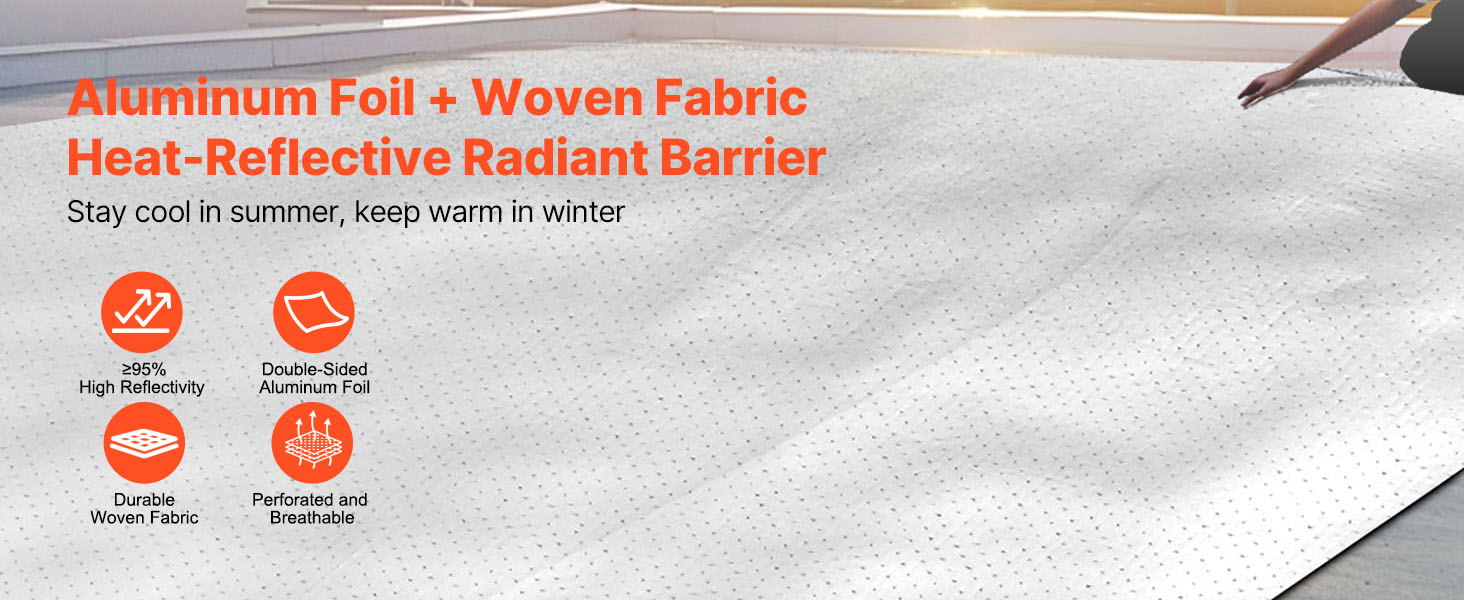 Dvojitá reflexná izolačná rolka VEVOR má ≥ 95 % vysokú odrazivosť, využíva dvojitú reflexnú hliníkovú fóliu a perforovanú tkanú textíliu. V lete blokuje slnečné žiarenie a v zime zabraňuje stratám tepla v interiéri, čím udržiava príjemnú teplotu v interiéri.