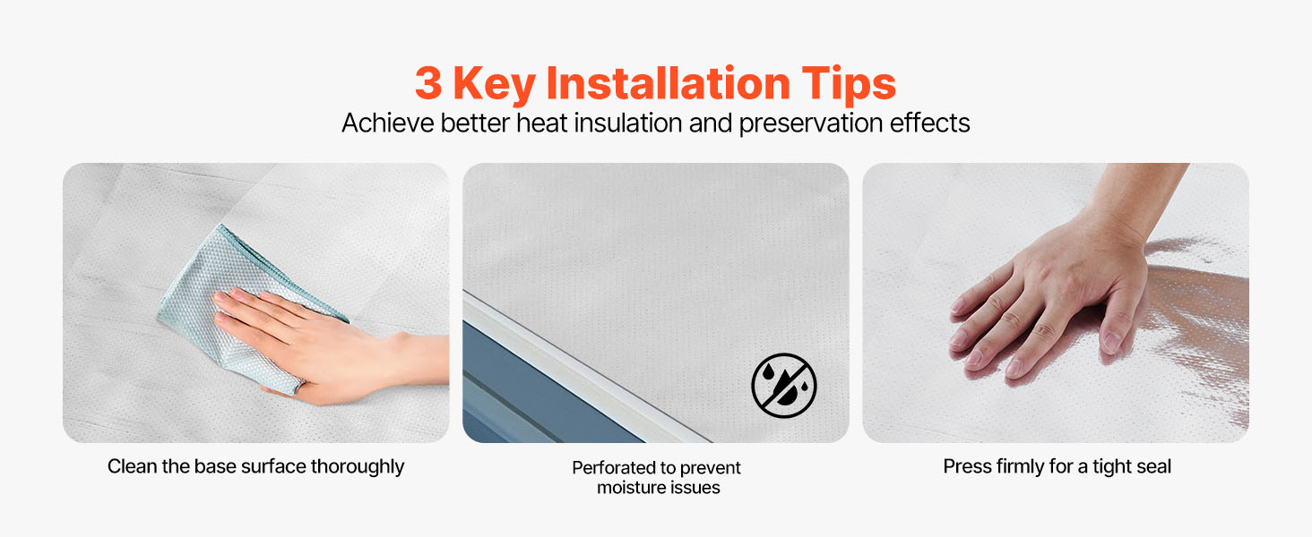 Aby ste maximalizovali účinnosť tepelnej izolácie, dodržiavajte 3 tipy pre inštaláciu: udržiavajte čistý a suchý podkladový povrch, zabráňte pôsobeniu vody aspoň jeden deň po aplikácii a pevne pritlačte, aby ste dosiahli tesné utesnenie a optimálny izolačný výkon.