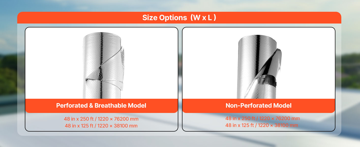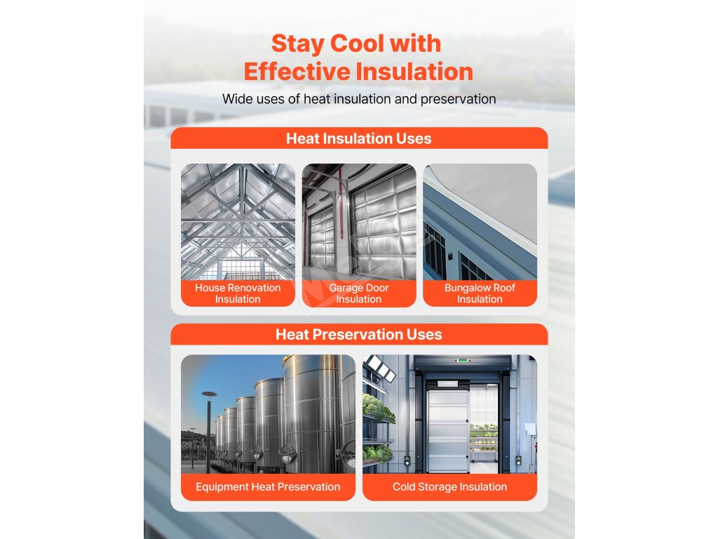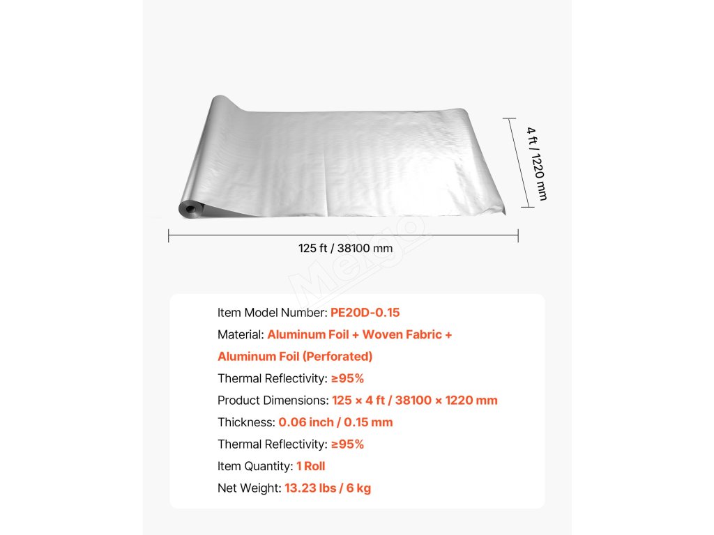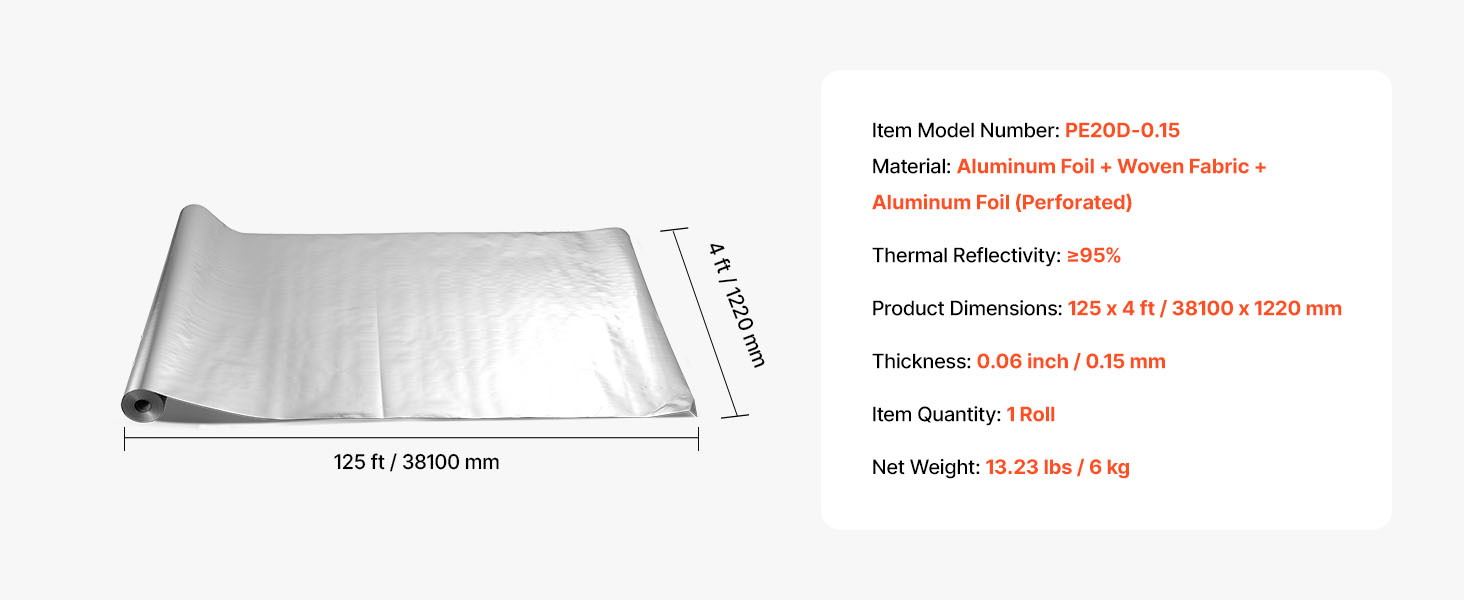 Dvojitá reflexná izolačná rolka VEVOR má ≥ 95 % vysokú odrazivosť, využíva dvojitú reflexnú hliníkovú fóliu a perforovanú tkanú textíliu. V lete blokuje slnečné žiarenie a v zime zabraňuje stratám tepla v interiéri, čím udržiava príjemnú teplotu v interiéri.
