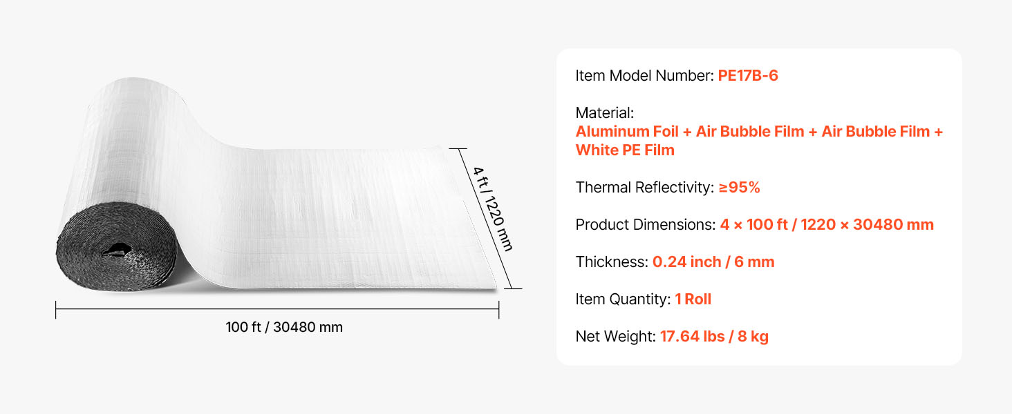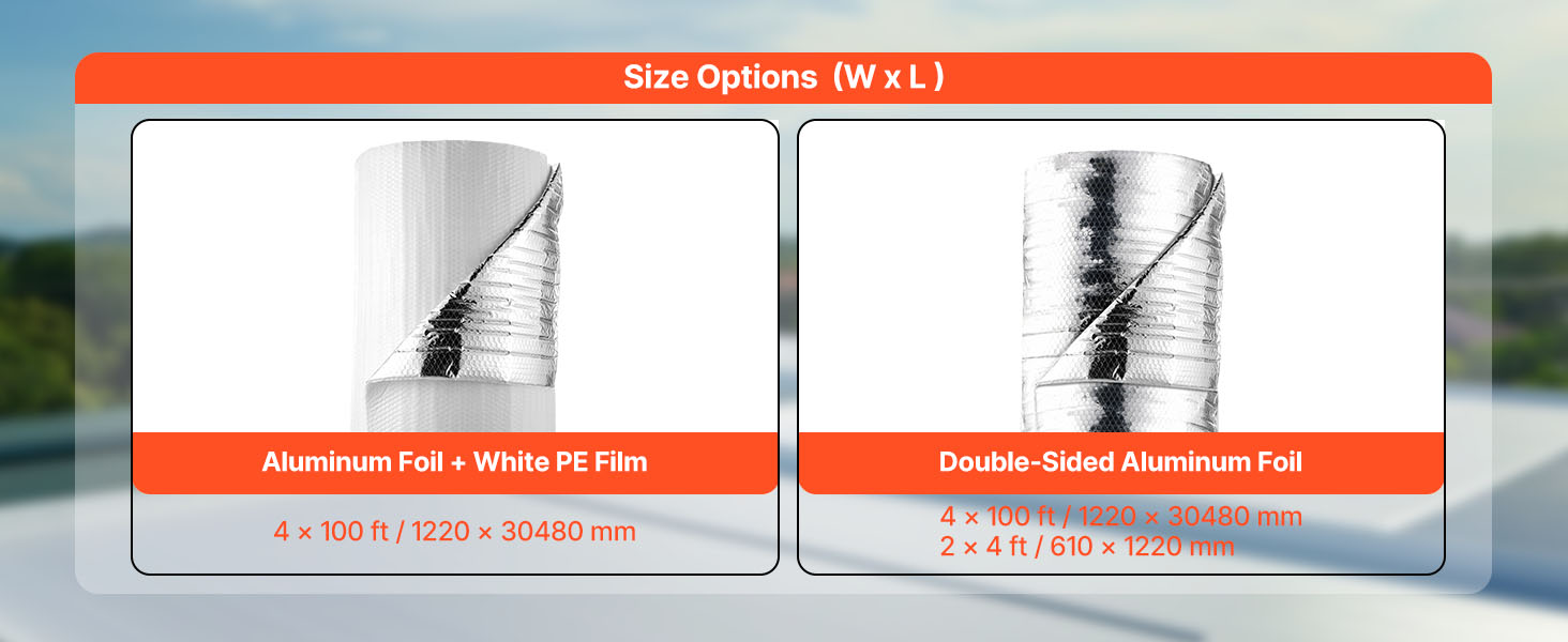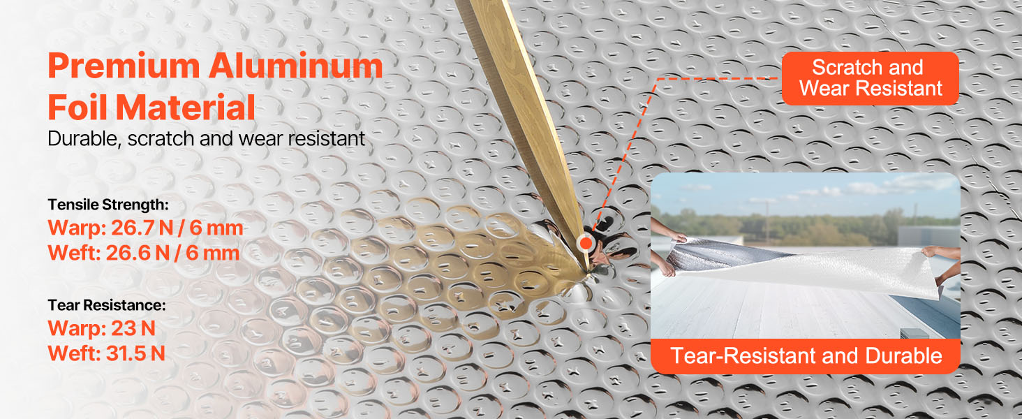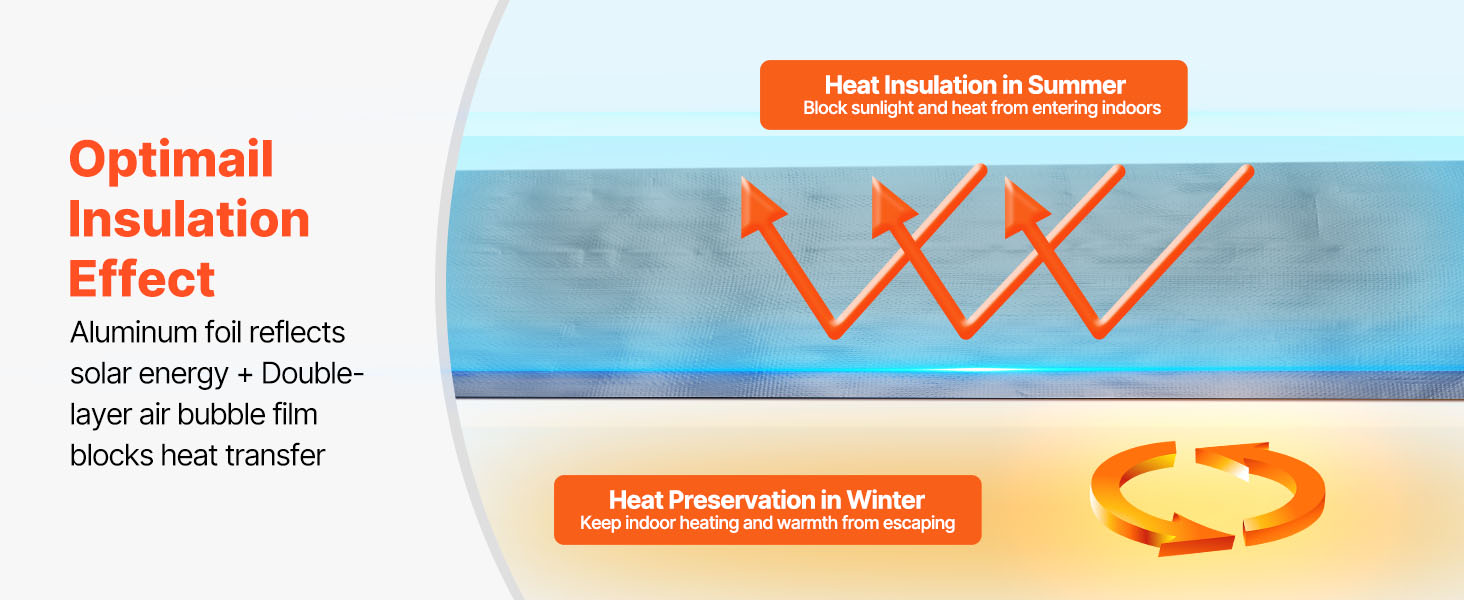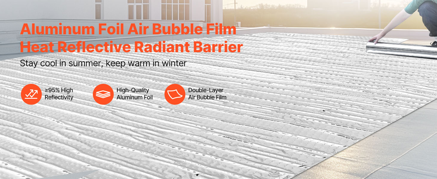 Reflexná izolačná rolka VEVOR má ≥ 95 % vysokú odrazivosť, je vyrobená z reflexnej hliníkovej fólie, dvojvrstvových vzduchových bublín a bielej PE fólie. V lete blokuje slnečné žiarenie a v zime zabraňuje stratám tepla v interiéri, čím udržiava príjemnú teplotu v interiéri.