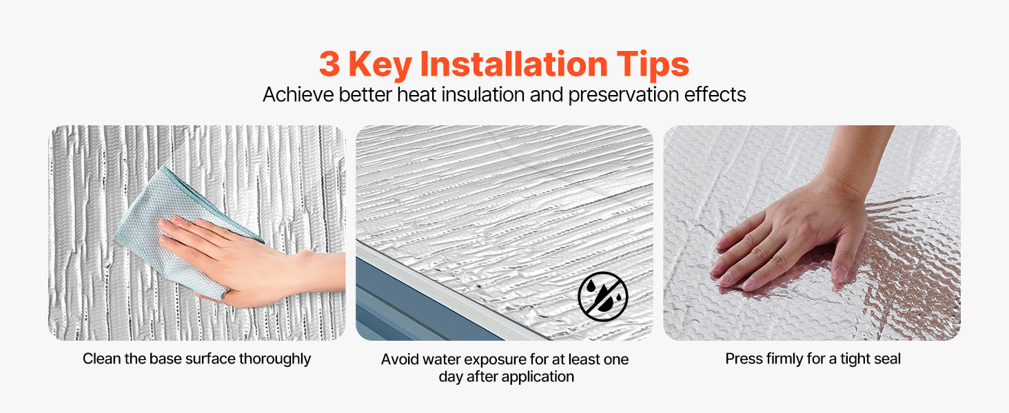 Aby ste maximalizovali účinnosť tepelnej izolácie, dodržiavajte 3 tipy na inštaláciu: udržiavajte čistý a suchý podkladový povrch, zabráňte pôsobeniu vody aspoň jeden deň po aplikácii a pevne pritlačte, aby ste dosiahli tesné utesnenie a optimálny izolačný výkon.