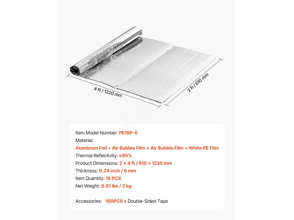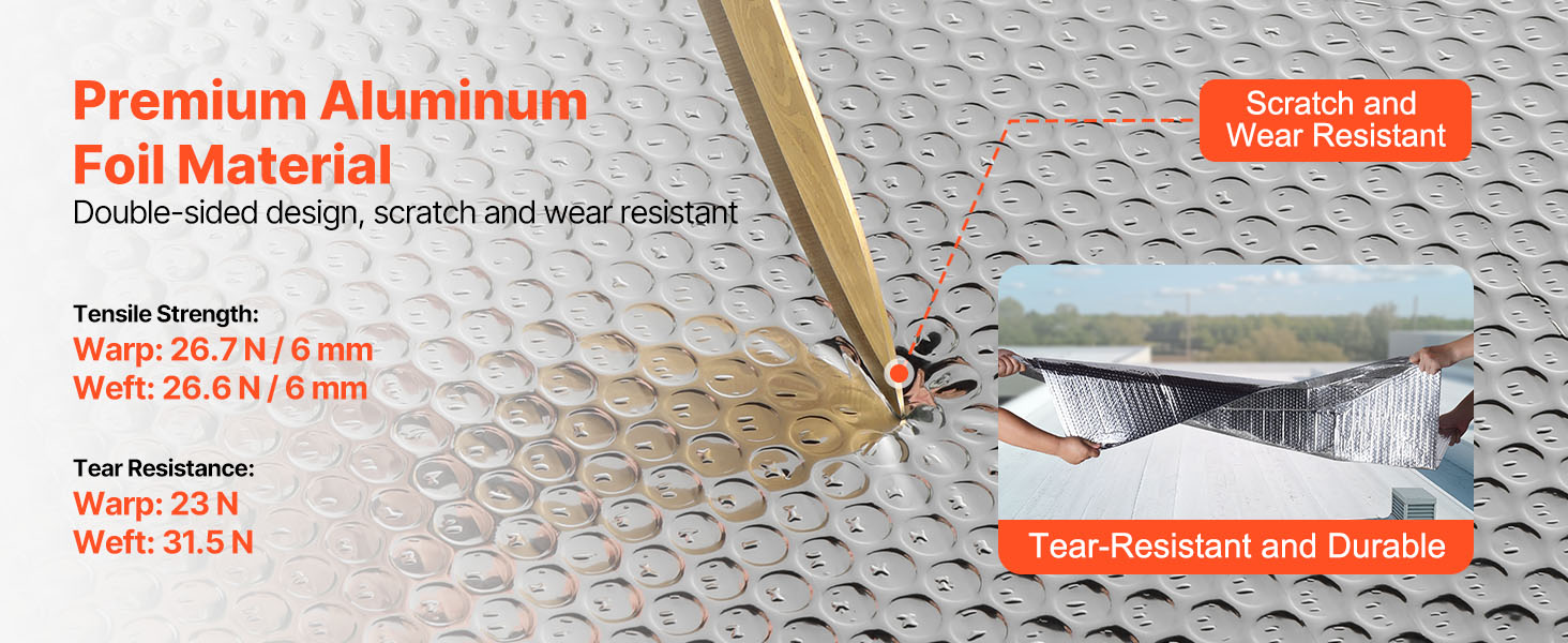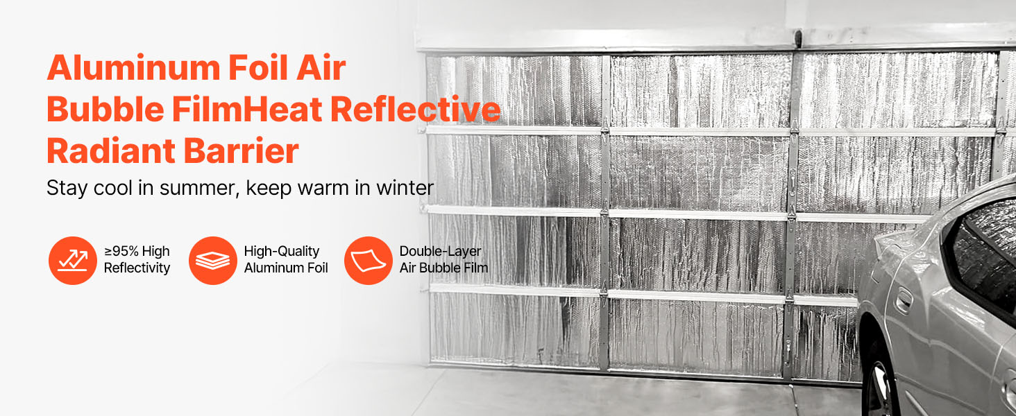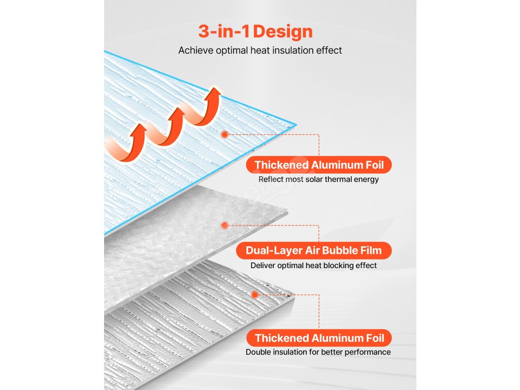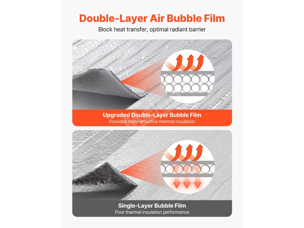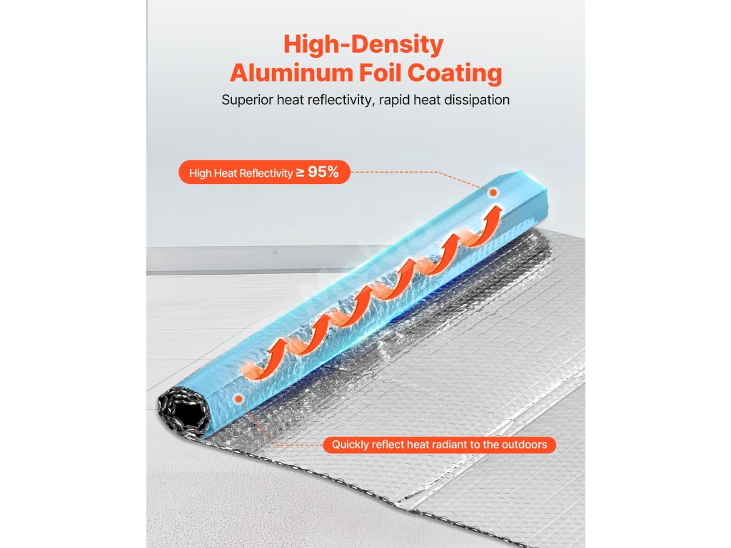 VEVOR 16-dielne dvojité reflexné izolačné fólie majú ≥ 95 % vysokú odrazivosť, sú vyrobené z obojstrannej hliníkovej fólie a dvojvrstvových vzduchových bublín. V lete blokuje slnečné žiarenie a v zime zabraňuje stratám tepla v interiéri, čím udržiava príjemnú teplotu v interiéri.