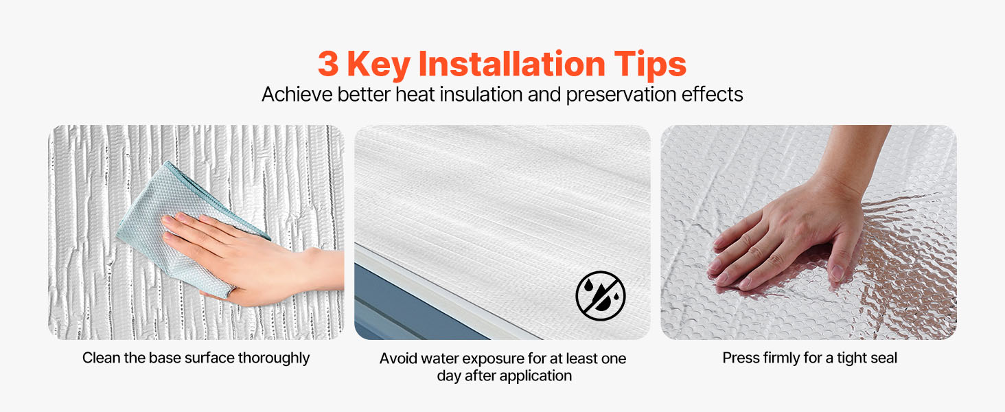 Aby ste maximalizovali účinnosť tepelnej izolácie, dodržiavajte 3 inštalačné tipy: udržiavajte čistý a suchý základný povrch, zabráňte pôsobeniu vody aspoň jeden deň po aplikácii a pevne pritlačte, aby ste dosiahli tesné utesnenie a optimálny izolačný výkon.