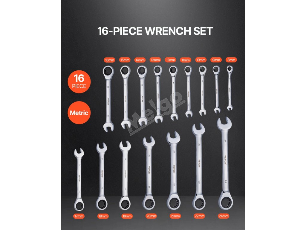 Sada ráčňových očkoplochých kľúčov 16-dielna 8-24 mm cr-v s držiakom