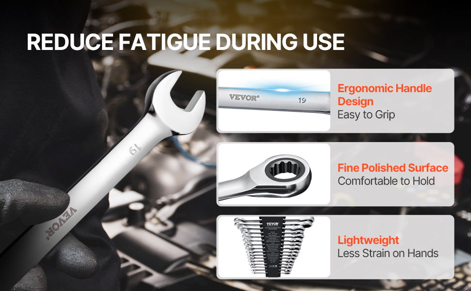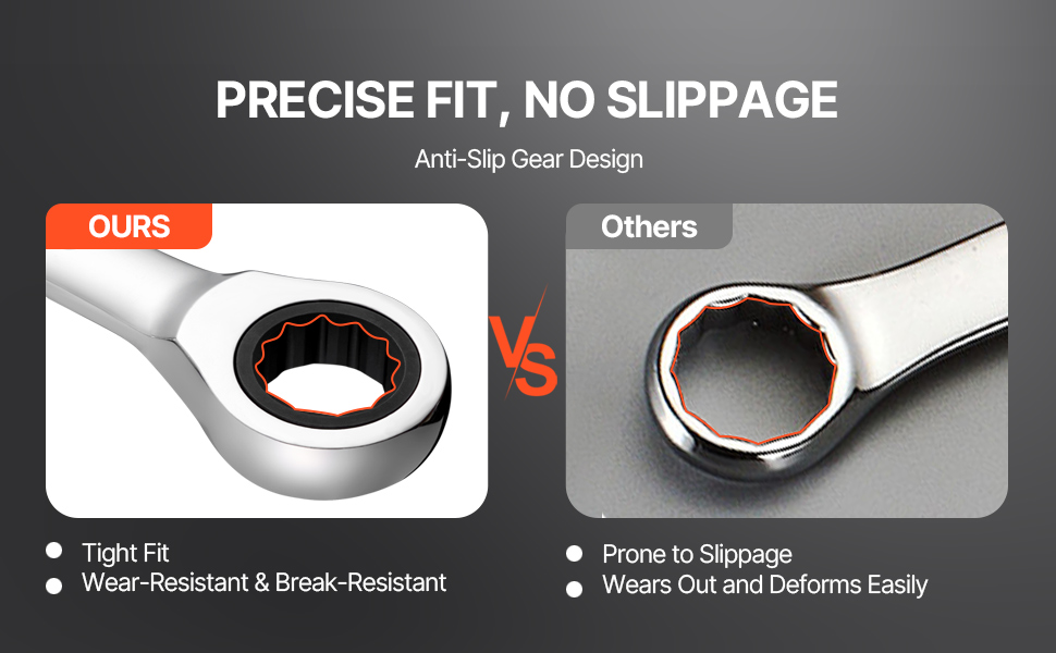 Protišmyková konštrukcia prevodov našej súpravy kombinovaných kľúčov znižuje preklzávanie a pomáha šetriť námahu, čím zefektívňuje vaše úlohy.