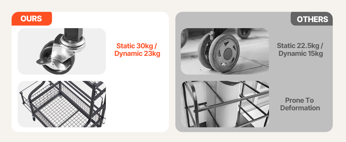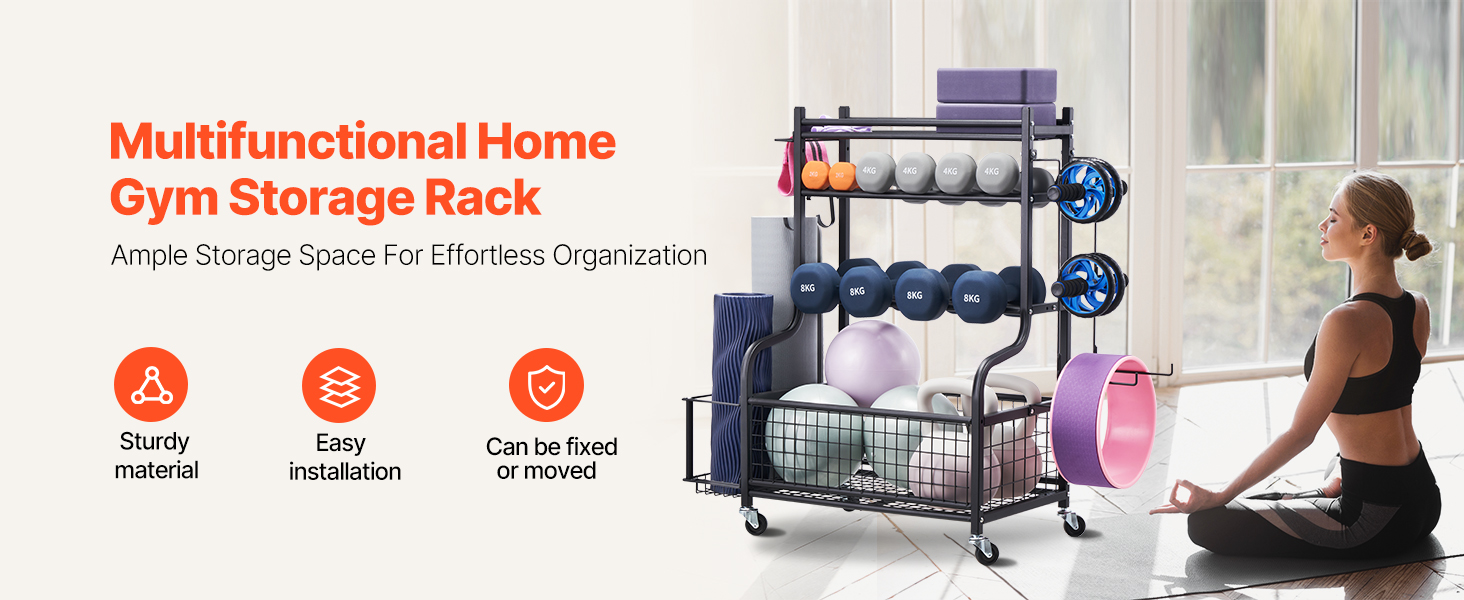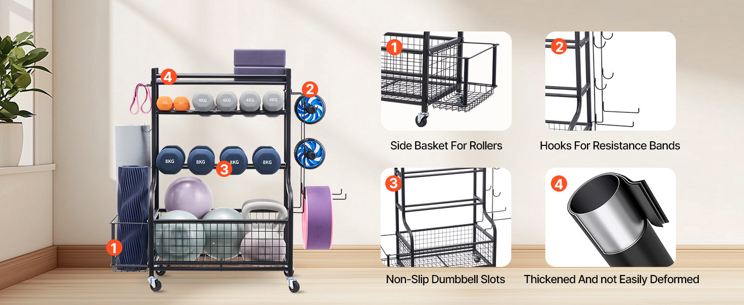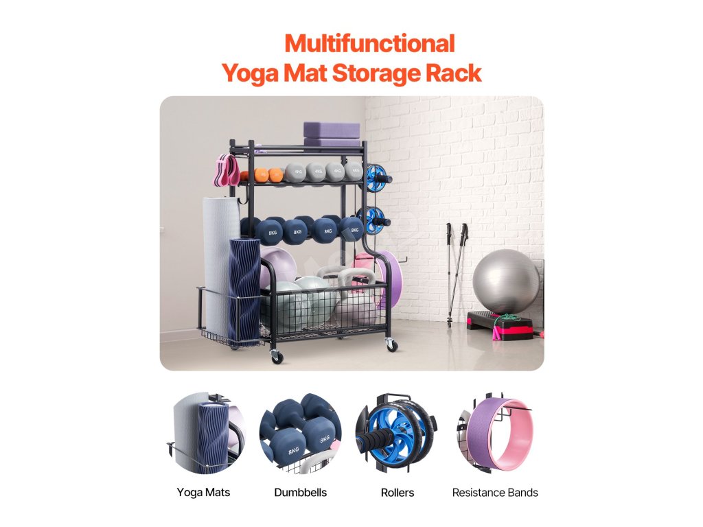 Vďaka rôznym úložným priestorom a metódam tento držiak na podložky na jogu maximalizuje úložnú kapacitu vášho tréningového vybavenia a uľahčuje prístup k položkám v spodnej časti. Je vybavený štyrmi robustnými 360-stupňovými kolieskami (dve sú uzamykateľné), čím spĺňa vaše požiadavky na mobilitu a stabilitu.