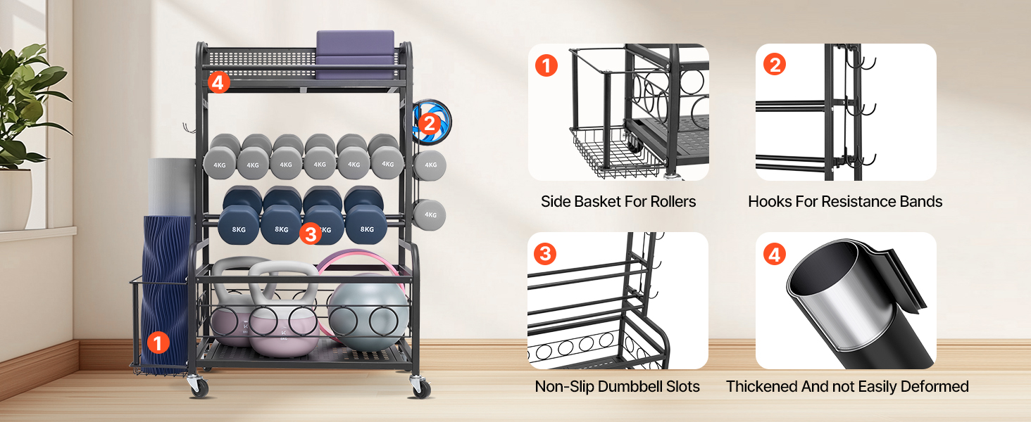 Organizér na domáce cvičebné a fitnes náčinie je vyrobený z vysokokvalitnej ocele s práškovou povrchovou úpravou, čo zaručuje robustnú a dlhotrvajúcu konštrukciu na roky používania. Protišmykové otvory na činky sú navrhnuté tak, aby zabránili riziku pádu závaží.