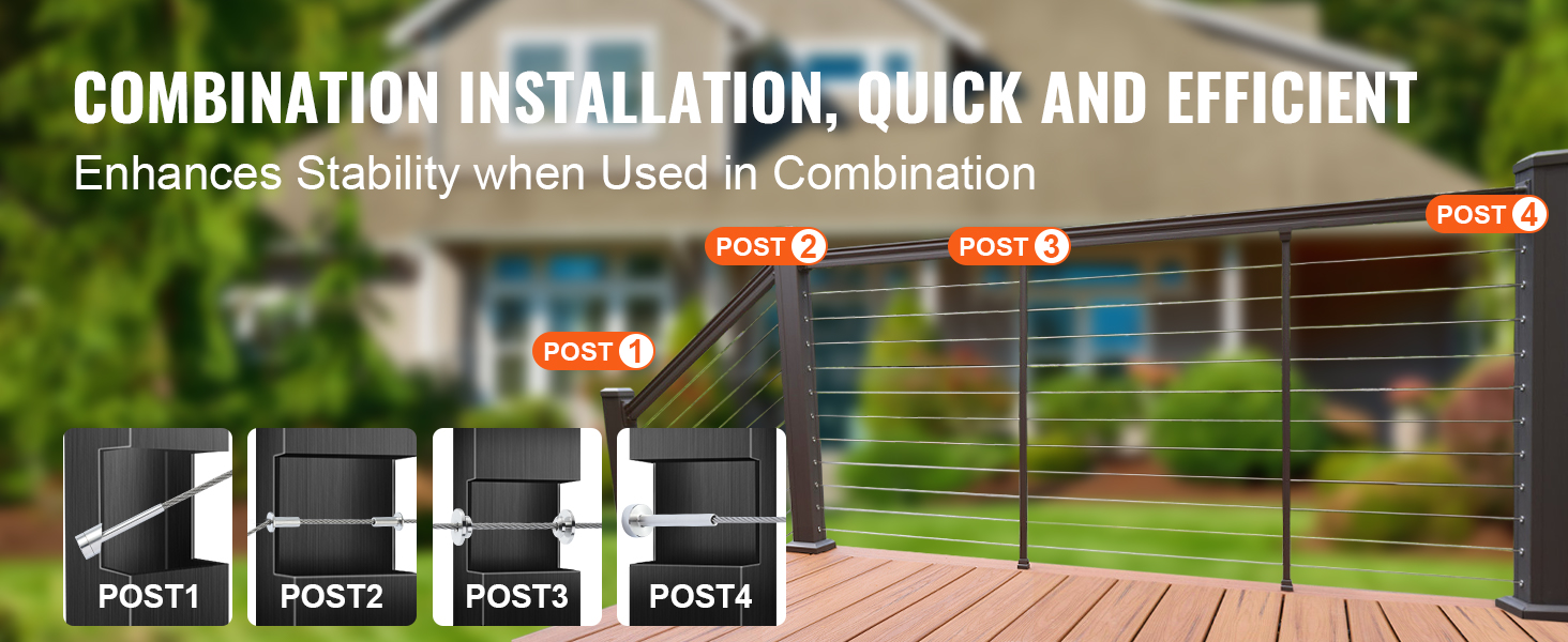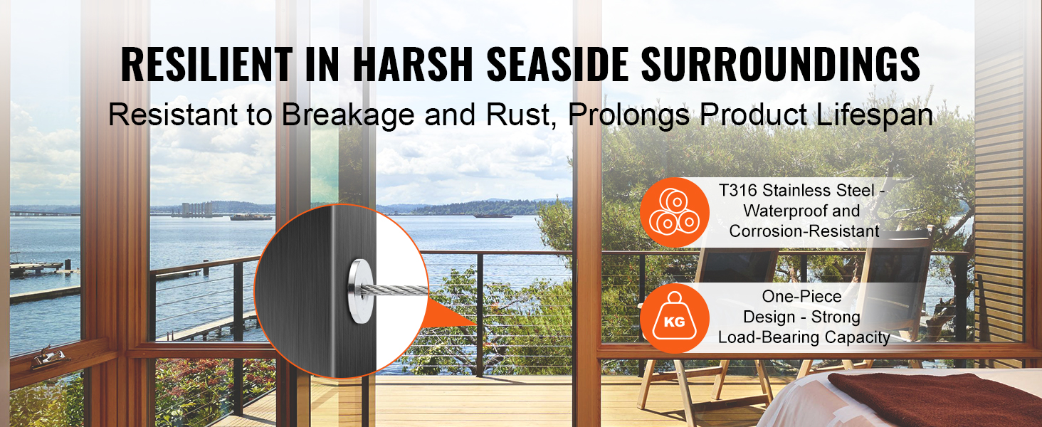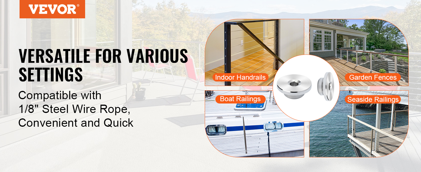 Táto súprava zábradlia je určená na použitie s inštaláciou 1/8" oceľového lanka a nachádza široké uplatnenie v rôznych prostrediach vrátane interiérových zábradlí, záhradných plotov a prímorských zábradlí, vďaka čomu je veľmi pohodlná a univerzálna.