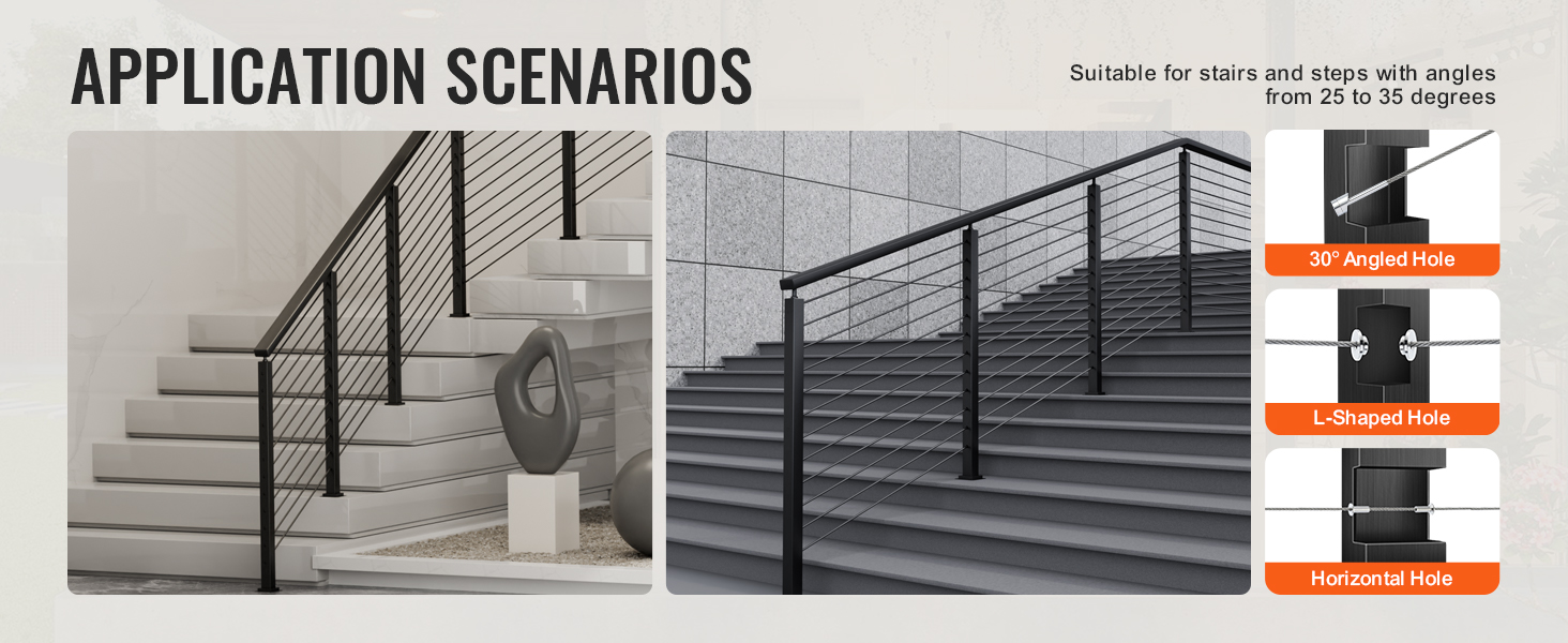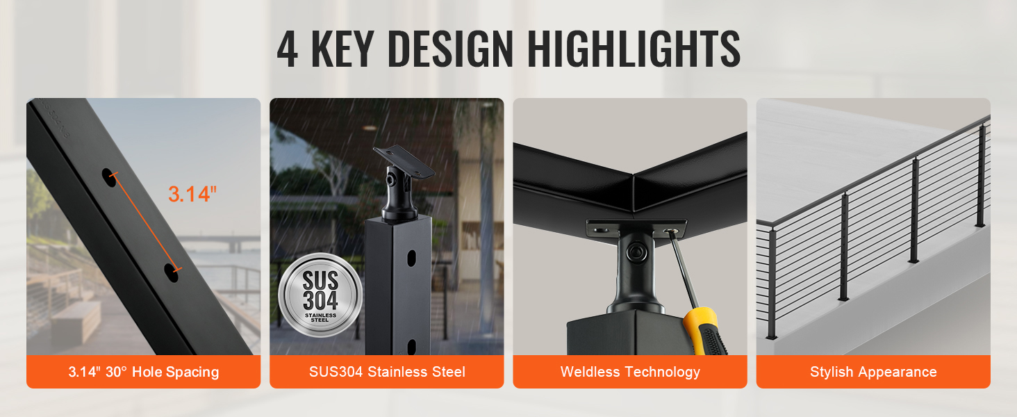Náš stĺpik káblového zábradlia je celý vyrobený z nehrdzavejúcej ocele SUS304 a vyznačuje sa rozstupom otvorov 3,14", ktorý je v súlade so stavebnými normami. Vďaka bezšvovej konštrukcii bez zvarov a štýlovej čiernej povrchovej úprave sú vhodné do rôznych prostredí a spájajú módu s funkčnosťou.