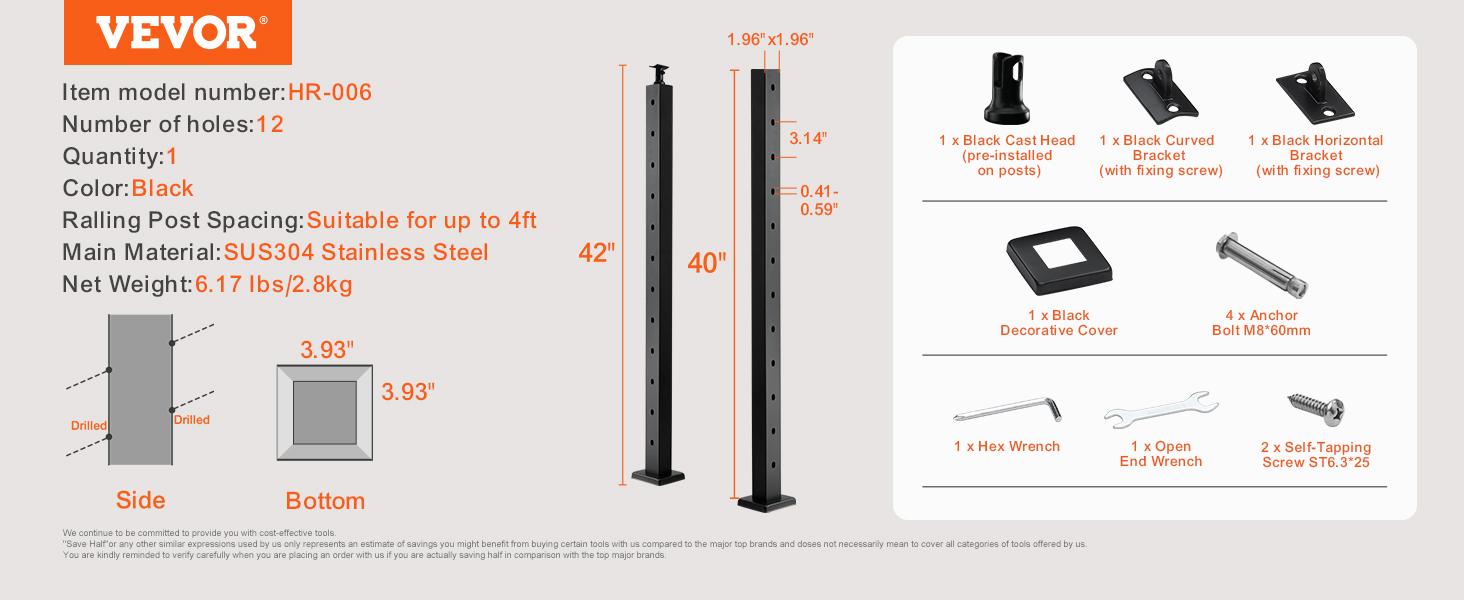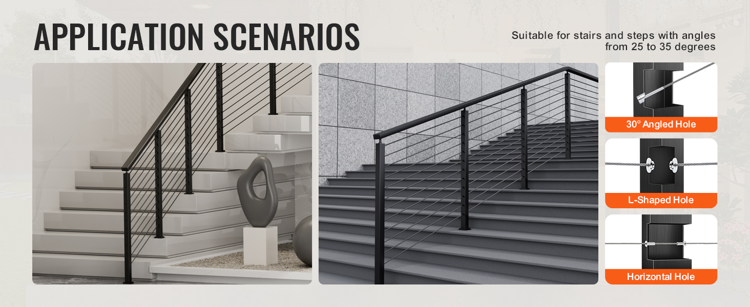 Náš stĺpik káblového zábradlia je celý vyrobený z nehrdzavejúcej ocele SUS304 a vyznačuje sa rozstupom otvorov 3,14", ktorý je v súlade so stavebnými normami. Vďaka bezšvovej konštrukcii bez zvarov a štýlovej čiernej povrchovej úprave sú vhodné do rôznych prostredí a spájajú módu s funkčnosťou.