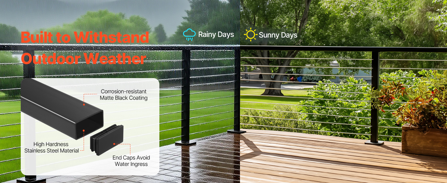 Toto zábradlie vyrobené z nehrdzavejúcej ocele 304 s matnou antikoróznou úpravou a vodotesnými koncovkami odoláva slnku, dažďu a snehu a ponúka dlhotrvajúcu ochranu v exteriéri.
