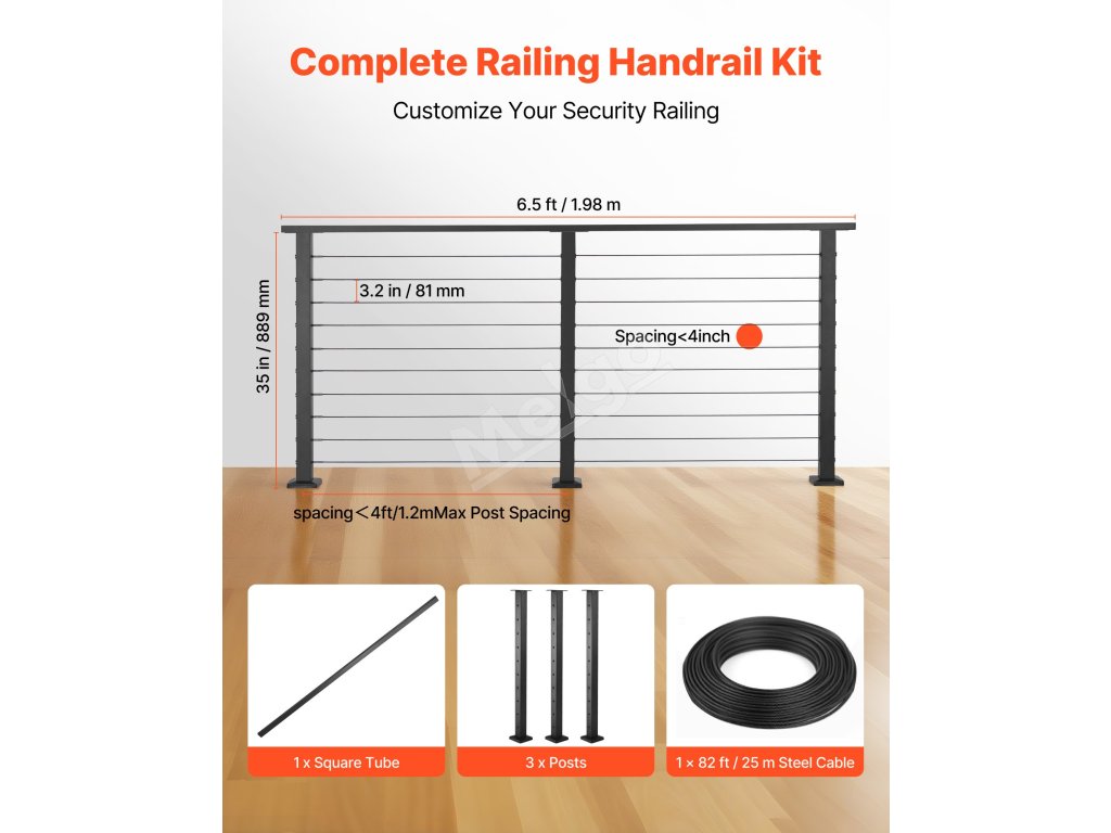 Súprava obsahuje pevné podložky, 82 stôp odolného kábla a skryté napínače, ktoré zabezpečujú bezpečnú inštaláciu. Vďaka skrytej konštrukcii sú napínače kábla skryté, čo poskytuje čistý vzhľad a pevnú oporu.