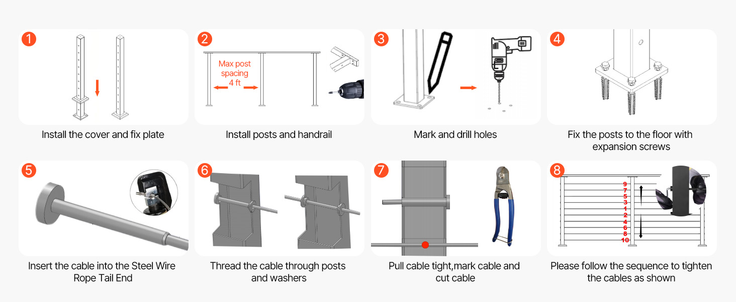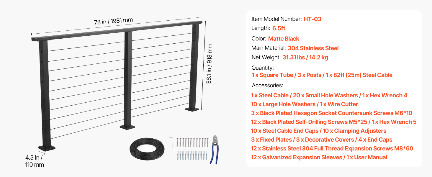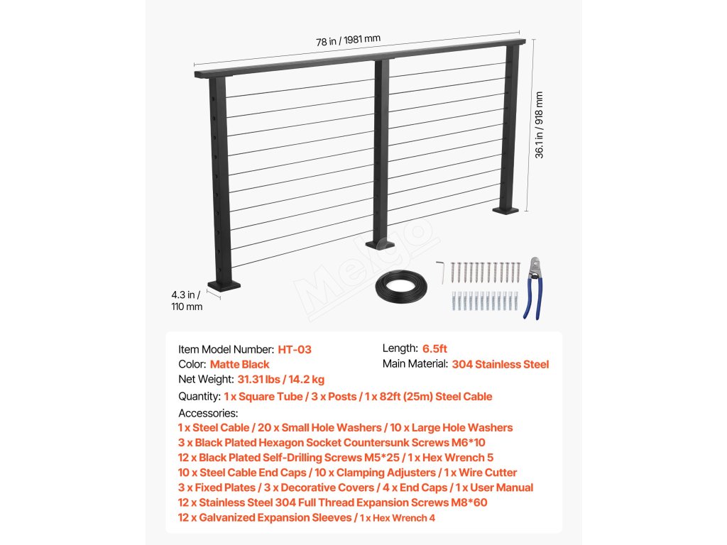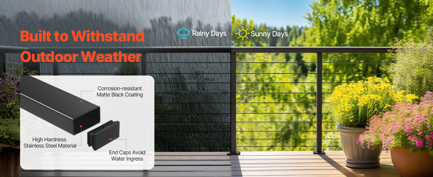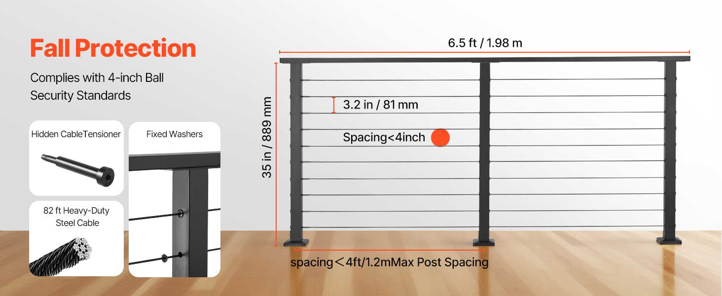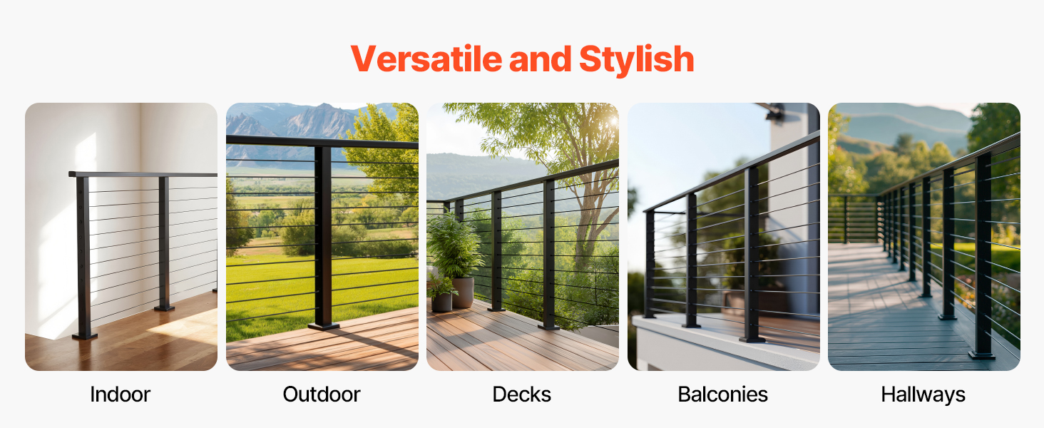 Vyrobené z prvotriednej nehrdzavejúcej ocele 304 s vynikajúcou odolnosťou proti korózii a hladkými hranami pre bezpečnosť. 35-palcové stĺpiky a 3,19-palcové rozstupy káblov spĺňajú normy, čím zabraňujú šplhaniu a pádom. Prispôsobiteľný dizajn na flexibilnú inštaláciu v rôznych priestoroch.