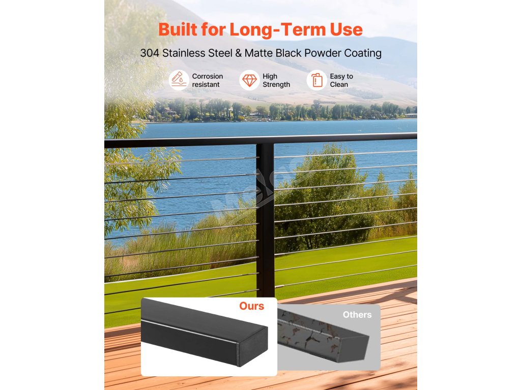 Toto zábradlie vyrobené z nehrdzavejúcej ocele 304 s matnou antikoróznou úpravou a vodotesnými koncovkami odoláva slnku, dažďu a snehu a ponúka dlhotrvajúcu ochranu v exteriéri.