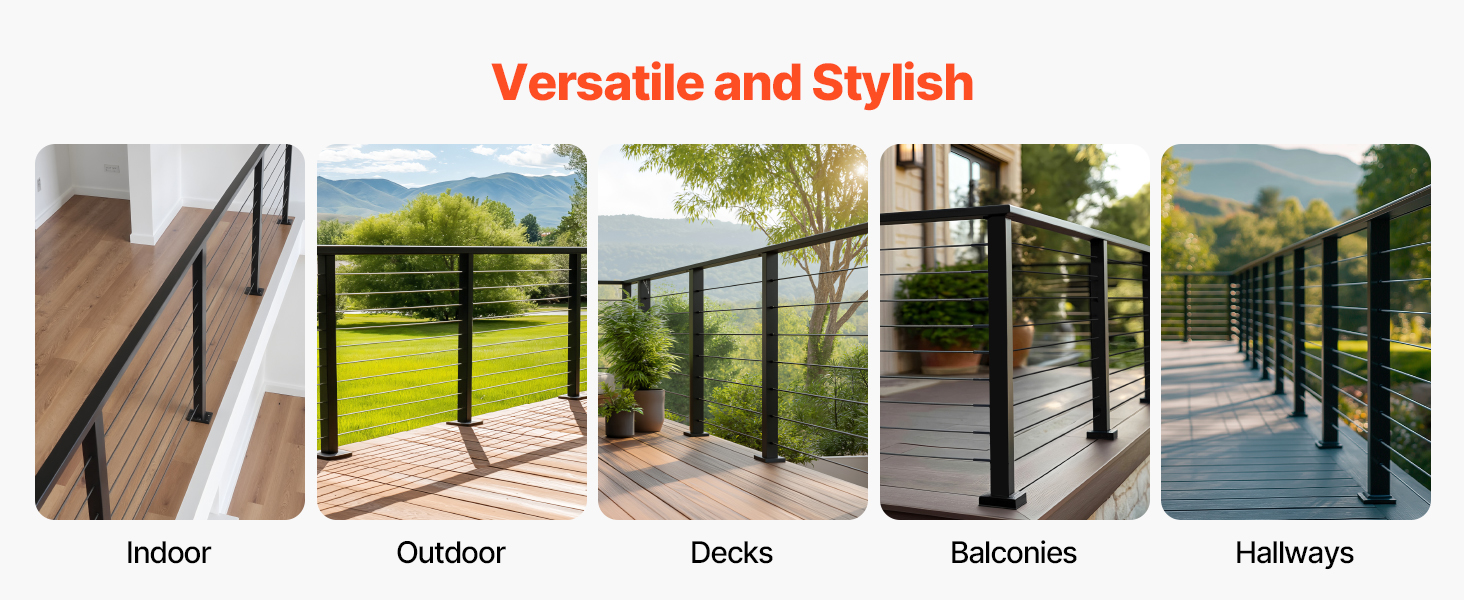 Vhodné pre vnútorné alebo vonkajšie priestory, ako sú paluby, balkóny alebo schody, a poskytuje spoľahlivú bezpečnosť pre váš dom alebo firmu.