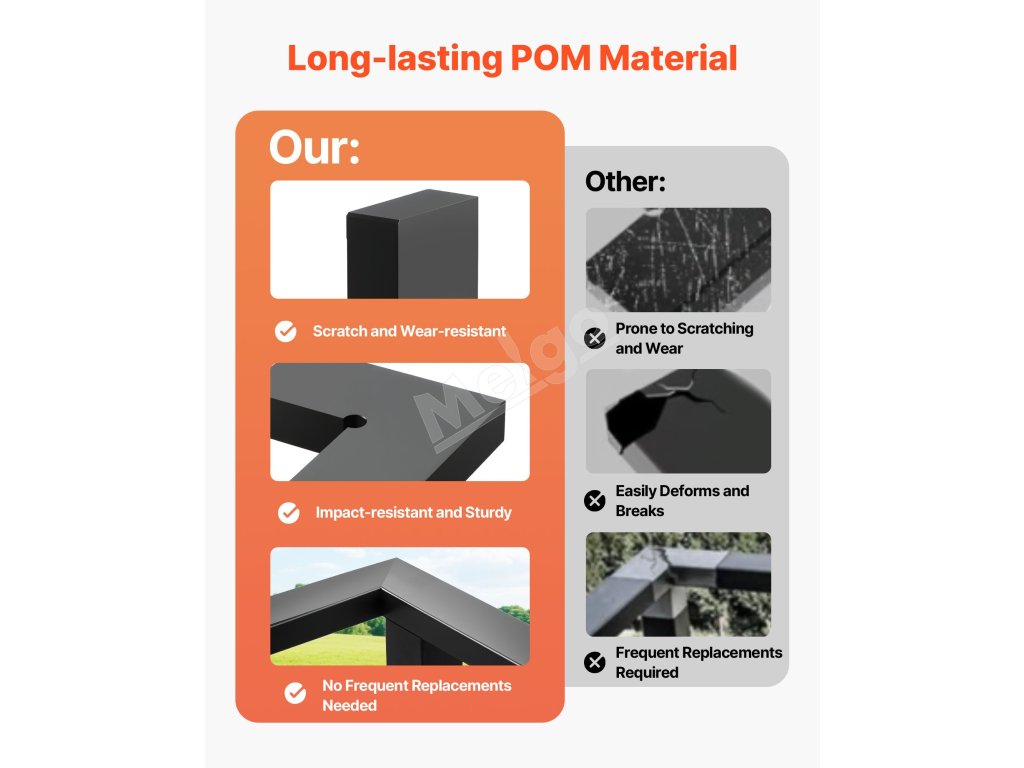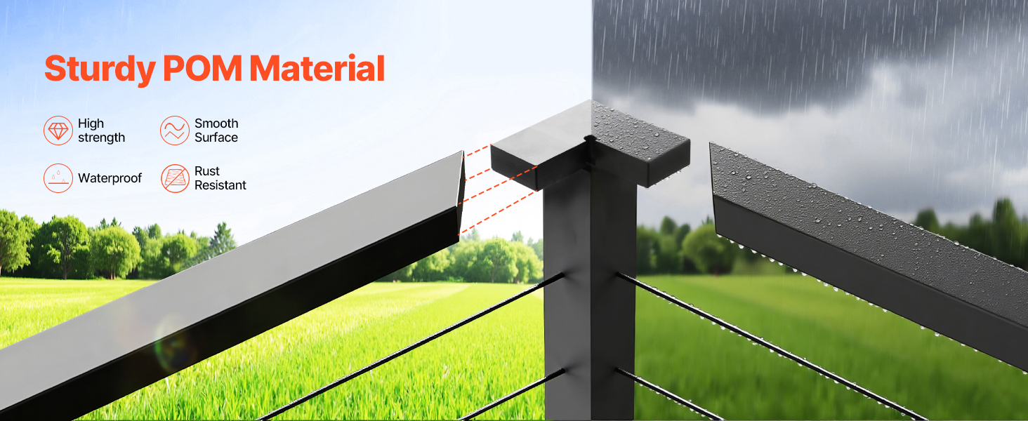 Tento konektor je vyrobený z vysokopevnostného POM, je hladký, vodotesný a odolný proti korózii. Odoláva nepriaznivým poveternostným podmienkam a ponúka dlhotrvajúcu podporu a spoľahlivú ochranu pre vaše zábradlie.