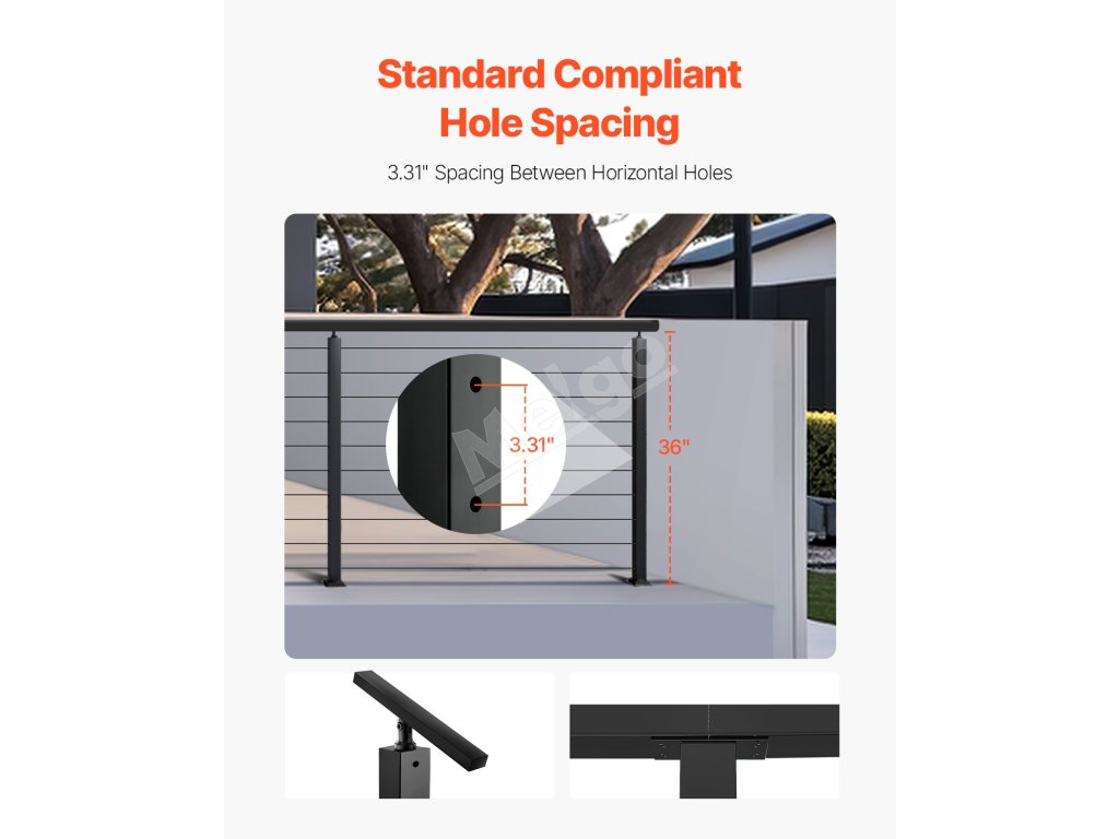 Náš systém káblového zábradlia je vyrobený z vysokokvalitnej nehrdzavejúcej ocele SUS304 a vyznačuje sa 3" rozstupmi otvorov, ktoré sú v súlade so stavebnými predpismi. Je nezváraný s čiernou povrchovou úpravou, vďaka čomu je štýlový a univerzálny pre rôzne nastavenia.
