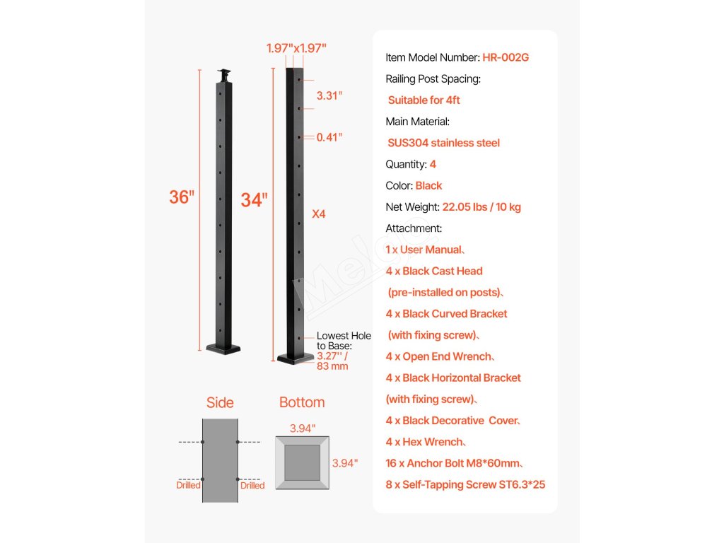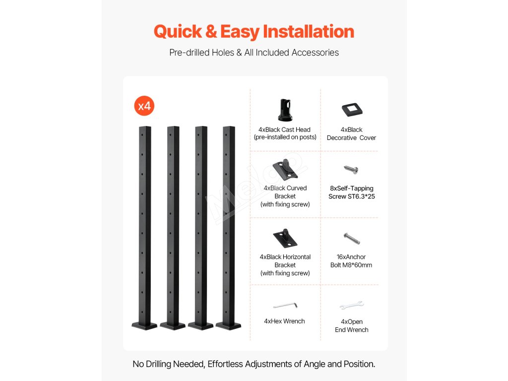 Toto schodiskové zábradlie sa dodáva s predvŕtanými otvormi, vďaka čomu nie je potrebné ďalšie vŕtanie. Umožňuje jednoduché nastavenie uhla a polohy počas inštalácie a obsahuje všetko potrebné príslušenstvo, čo šetrí prácu.