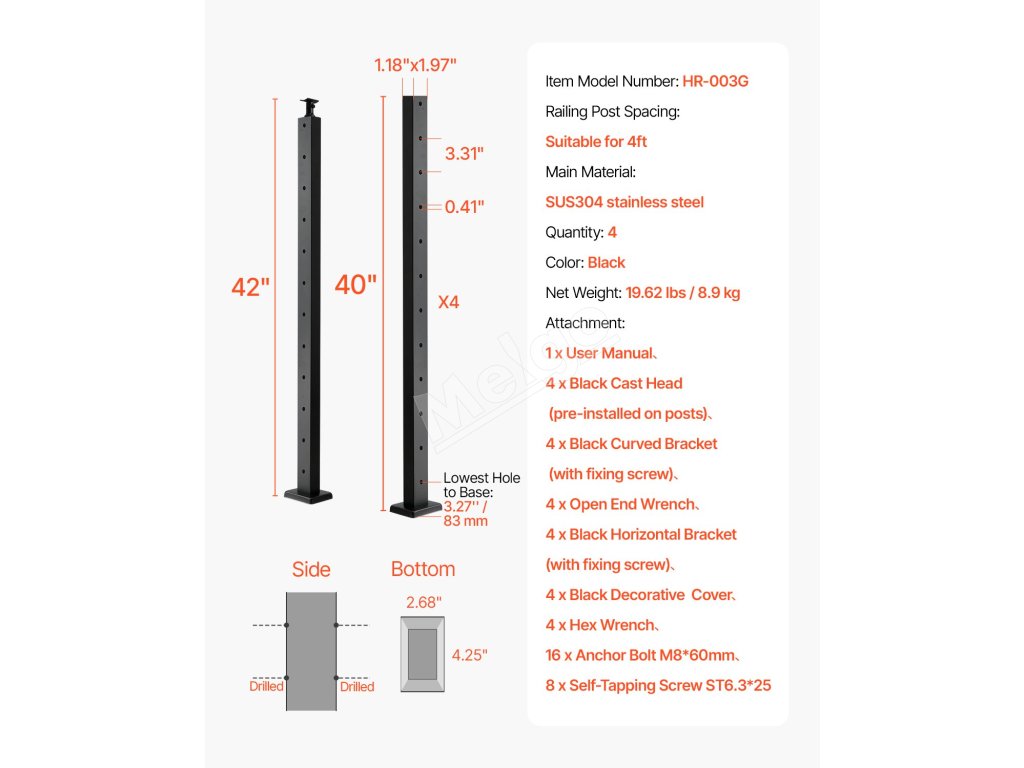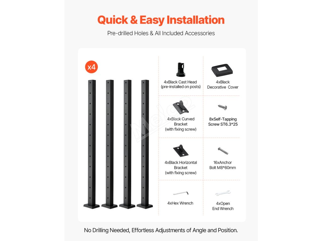 Toto schodiskové zábradlie sa dodáva s predvŕtanými otvormi, vďaka čomu nie je potrebné ďalšie vŕtanie. Umožňuje jednoduché nastavenie uhla a polohy počas inštalácie a obsahuje všetko potrebné príslušenstvo, čo šetrí prácu.