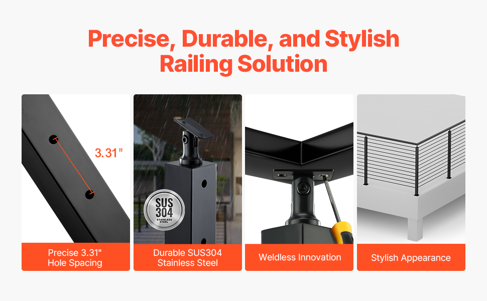 Náš systém káblového zábradlia je vyrobený z vysokokvalitnej nehrdzavejúcej ocele SUS304 a vyznačuje sa 3" rozstupmi otvorov, ktoré sú v súlade so stavebnými predpismi. Je nezváraný s čiernou povrchovou úpravou, vďaka čomu je štýlový a univerzálny pre rôzne nastavenia.
