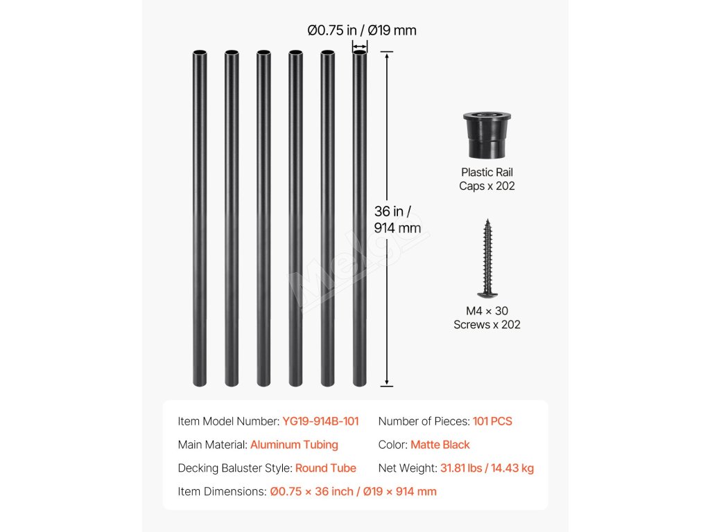 Vretená do zábradlia 101 ks 36 in 3/4 inch hliníkové duté s skrutkami
