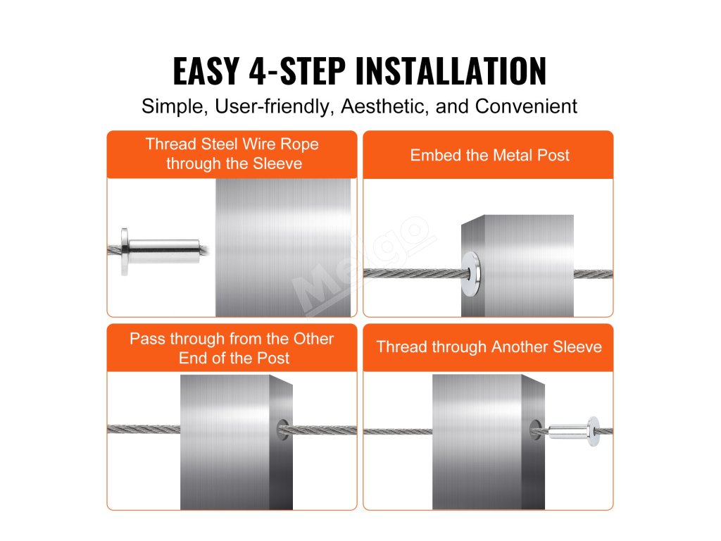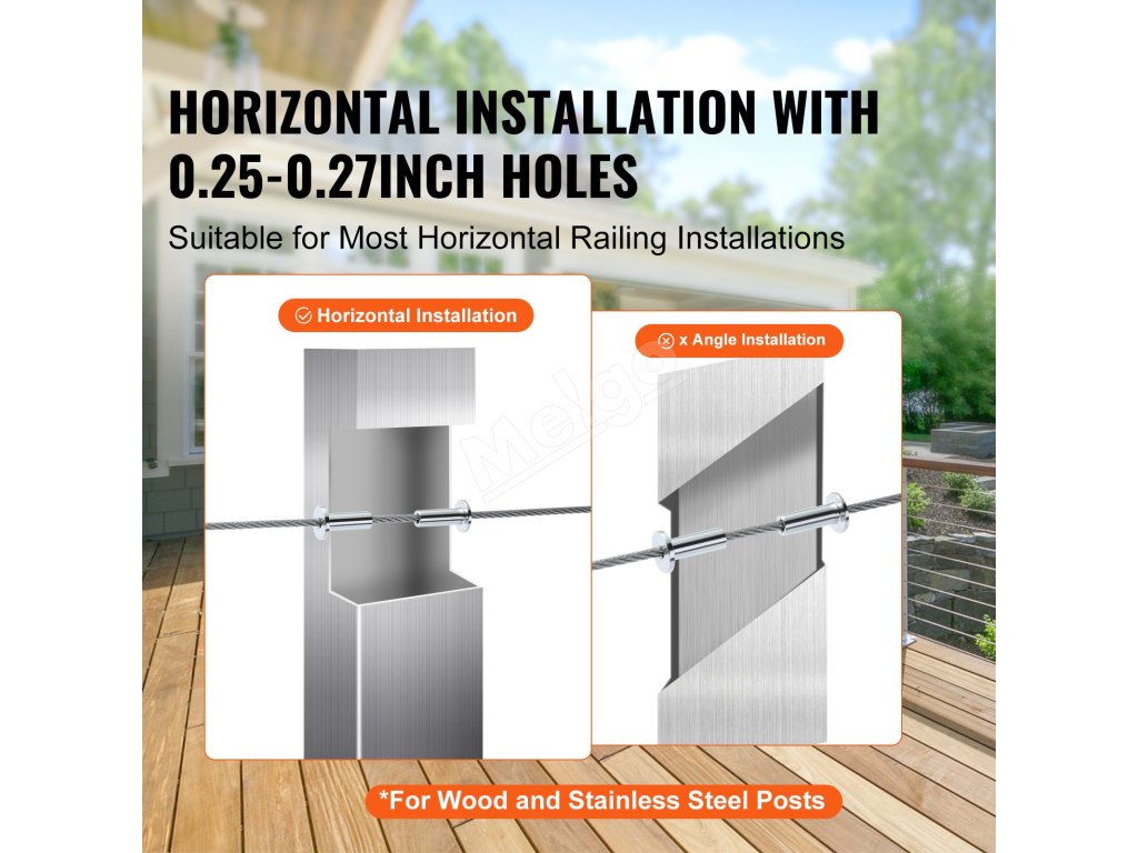 Táto súprava zábradlia je určená na použitie s inštaláciou 1/8" oceľového lanka a nachádza široké uplatnenie v rôznych prostrediach vrátane interiérových zábradlí, záhradných plotov a prímorských zábradlí, vďaka čomu je veľmi pohodlná a univerzálna.