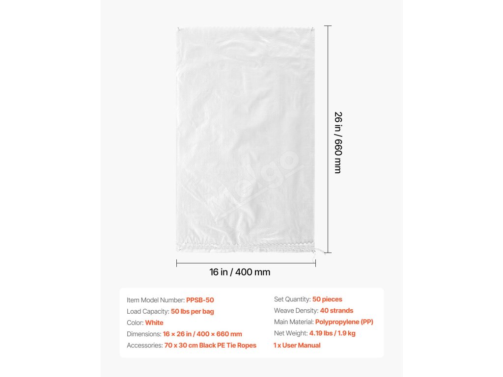 Pieskové vaky 50 ks 40×66 cm, 22.6 kg kapacita, polypropylén