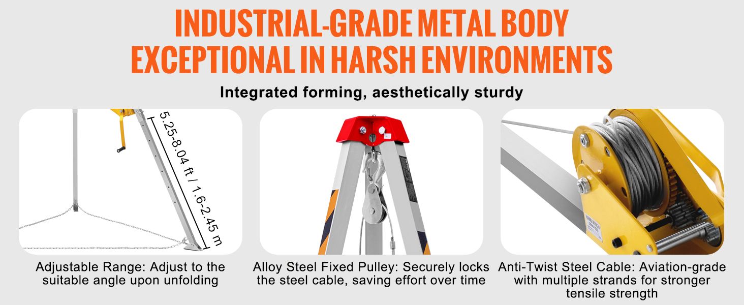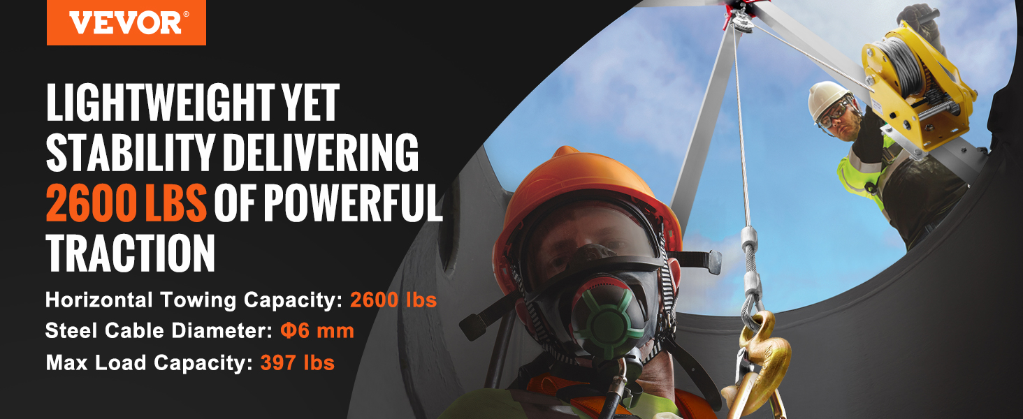 S horizontálnou ťažnou kapacitou 2600 lbs je náš statív pre stiesnené priestory pripravený zvládnuť akúkoľvek výzvu. Je vybavená oceľovým lanom Φ6 mm, ktoré dokáže zdvihnúť až 397 lbs, a je vaším pomocníkom pri náročných úlohách v akomkoľvek prostredí.