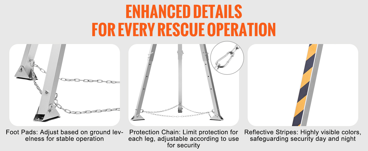 Nastaviteľné nohy nášho záchranárskeho vybavenia pre uzavreté priestory sa prispôsobia akémukoľvek terénu a zabezpečia pevnú stabilitu. Ochranné reťaze posilňujú oporné nohy pre väčšiu bezpečnosť a reflexné pásy zvyšujú viditeľnosť vo dne aj v noci. Je to jednoduchá bezpečnosť!