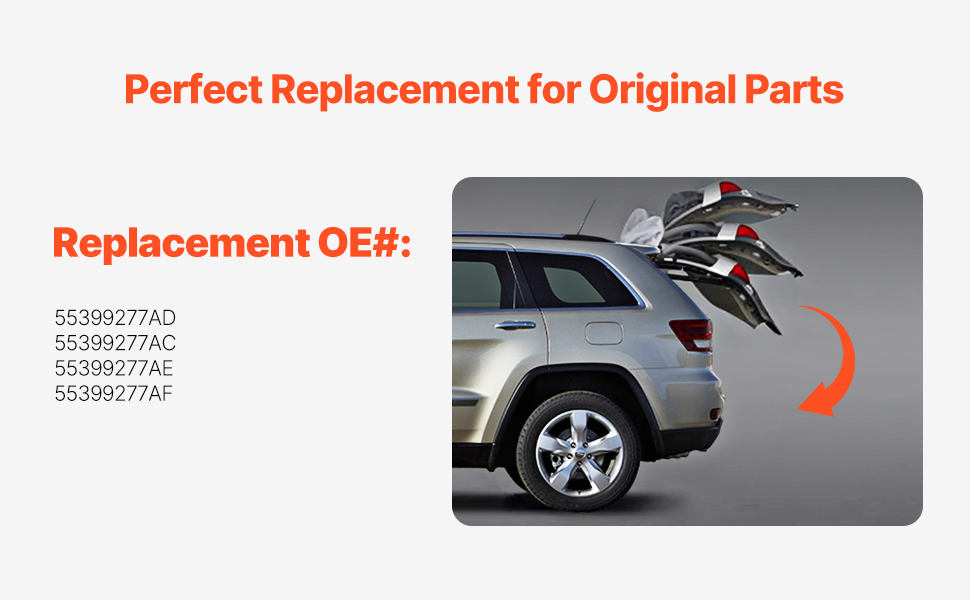 Táto vzpera elektrického zdvíhania zadných ľavých dverí je kompatibilná s modelovým radom Jeep Grand Cherokee WK2 2011-2012 a ponúka 408N silnú oporu pre hladké a spoľahlivé zdvíhanie dverí. Je skonštruovaný tak, aby nahradil originálny diel č. 55399277AD, 55399277AC, 55399277AE a 55399277AF, a zaručuje presné uchytenie a jednoduchú montáž.