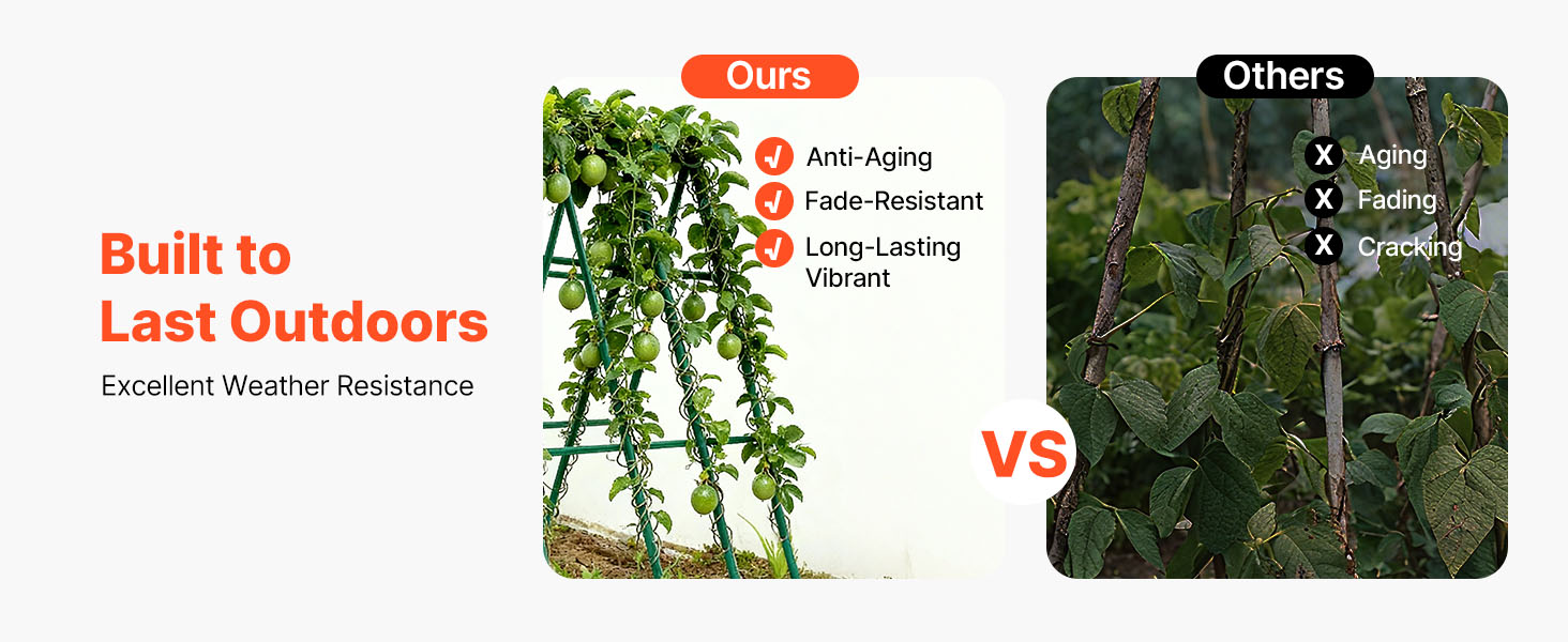 Záhradné kolíky majú povrch potiahnutý plastom na silnú ochranu, odolávajú vlhku, slnečnému žiareniu a hrdzi, čím zabraňujú vyblednutiu a poškodeniu. Vydrží dlhodobé vystavenie slnku a dažďu, takže je ideálny na dlhodobé používanie v záhradách, na dvoroch alebo v iných vonkajších záhradných prostrediach.