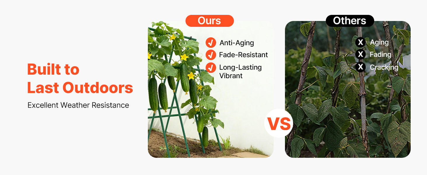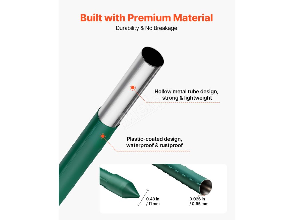 Záhradné kolíky majú povrch potiahnutý plastom na silnú ochranu, odolávajú vlhku, slnečnému žiareniu a hrdzi, čím zabraňujú vyblednutiu a poškodeniu. Vydrží dlhodobé vystavenie slnku a dažďu, takže je ideálny na dlhodobé používanie v záhradách, na dvoroch alebo v iných vonkajších záhradných prostrediach.