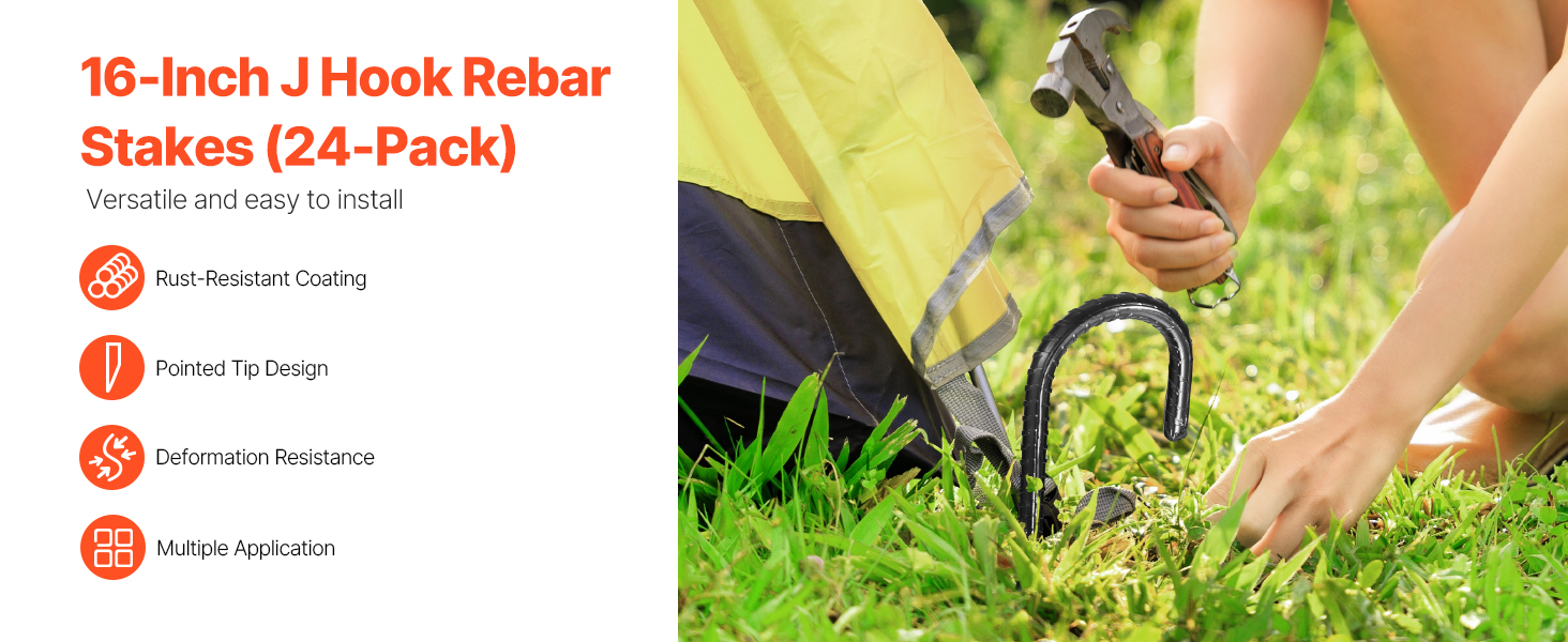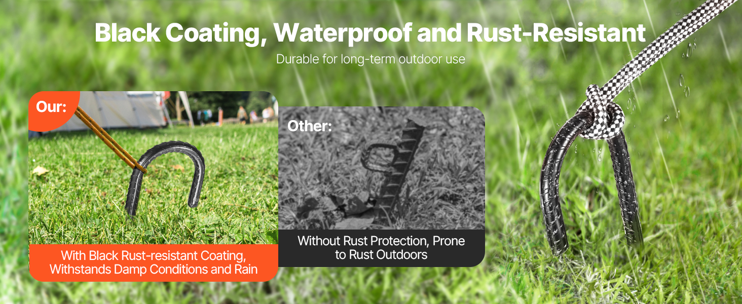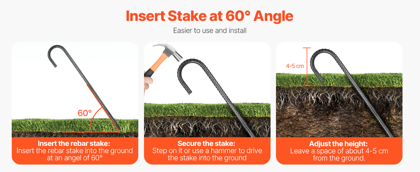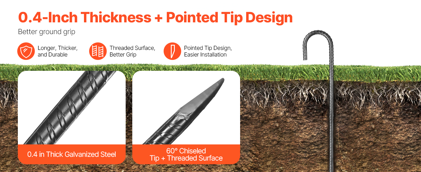 Naše kolíky s priemerom 0,4 palca poskytujú výnimočnú odolnosť voči ťahu a stabilitu. Sú vyrobené z pozinkovanej ocele HRB400E a potiahnuté čiernou práškovou farbou pre vynikajúcu odolnosť proti korózii. Sú ideálne do silného vetra a náročného terénu a možno ich použiť v rôznych vonkajších aplikáciách.