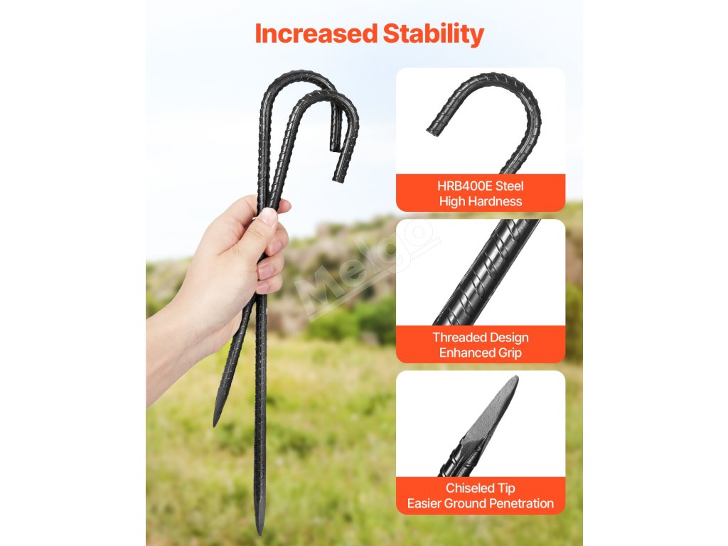 Naše kolíky s priemerom 0,4 palca poskytujú výnimočnú odolnosť voči ťahu a stabilitu. Sú vyrobené z pozinkovanej ocele HRB400E a potiahnuté čiernou práškovou farbou pre vynikajúcu odolnosť proti korózii. Sú ideálne do silného vetra a náročného terénu a možno ich použiť v rôznych vonkajších aplikáciách.