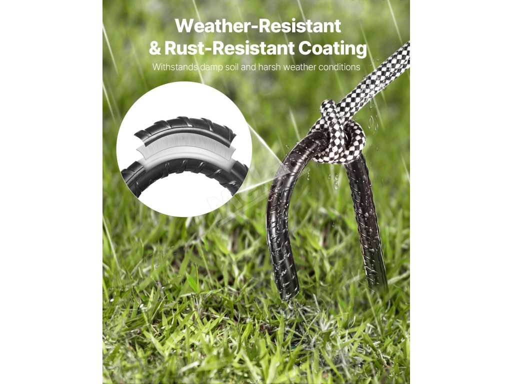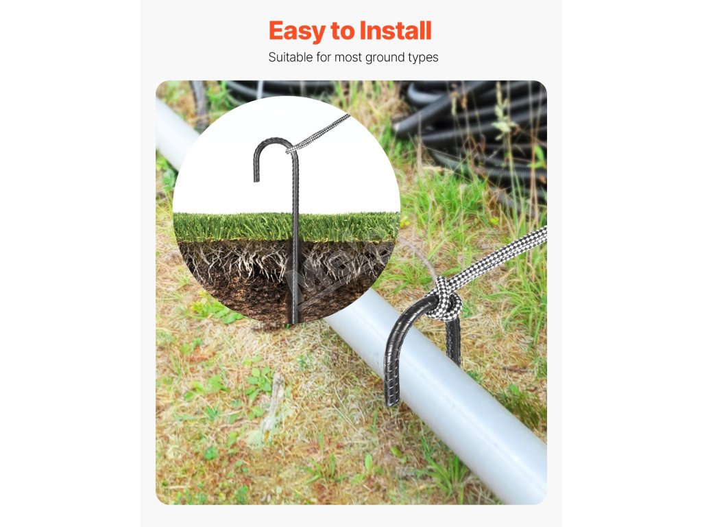 Naše kolíky s priemerom 0,4 palca poskytujú výnimočnú odolnosť voči ťahu a stabilitu. Sú vyrobené z pozinkovanej ocele HRB400E a potiahnuté čiernou práškovou farbou pre vynikajúcu odolnosť proti korózii. Sú ideálne do silného vetra a náročného terénu a možno ich použiť v rôznych vonkajších aplikáciách.